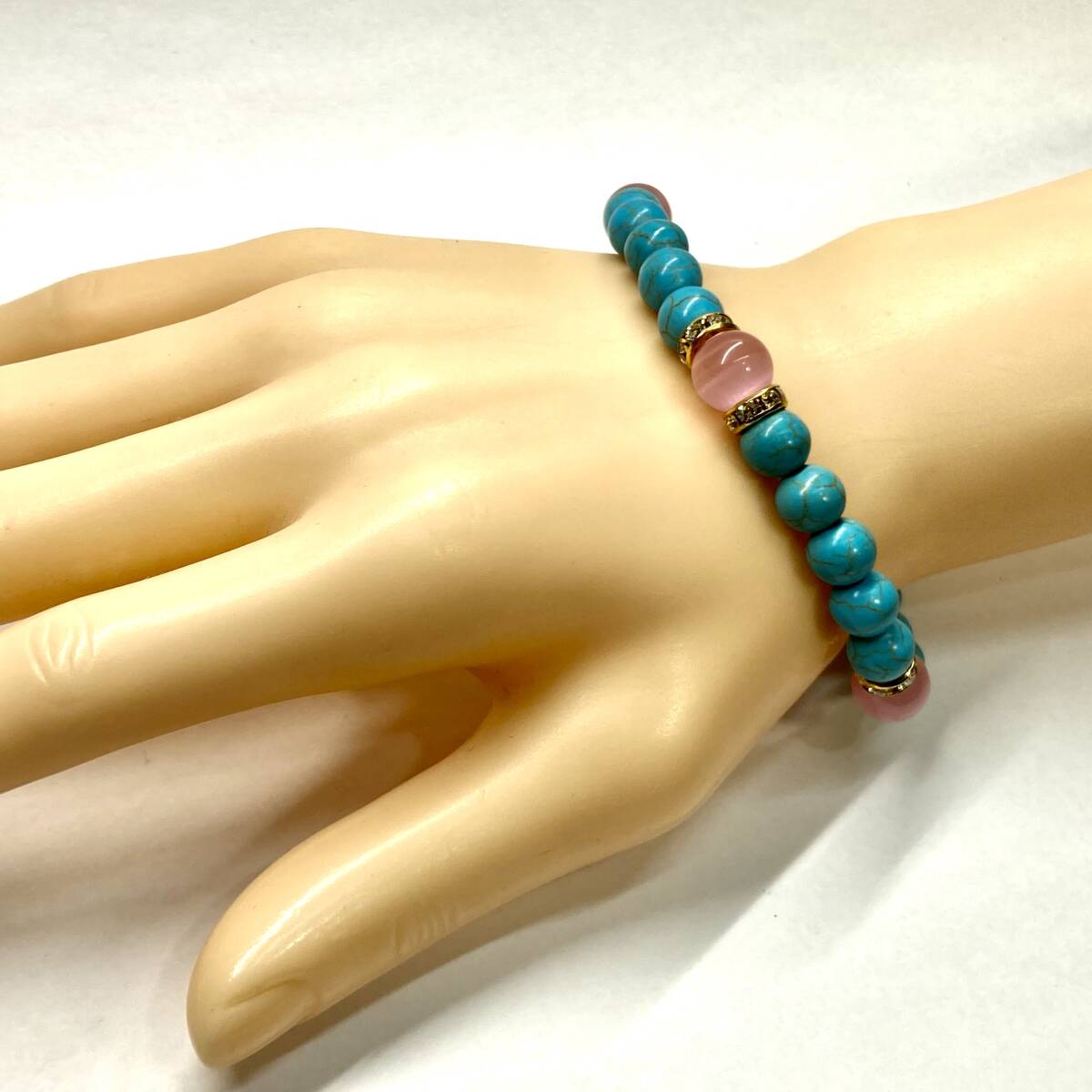 こちらは、8mm玉のキャッツアイとターコイズを使用したパワーストーンブレスレットです。間にはロンデルを挟み高級感ある大人っぽいデザインに仕上がっています。内周約17cmです。気になる方は是非この機会にどうぞ。