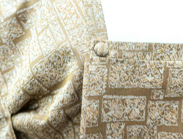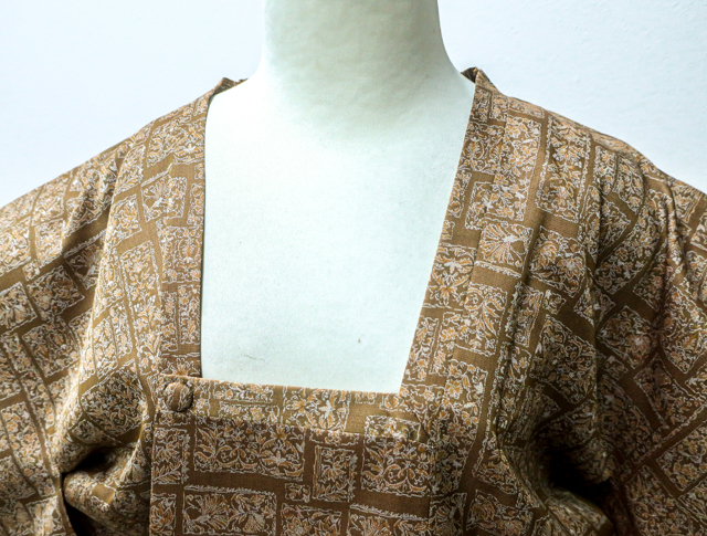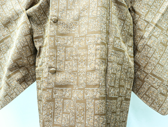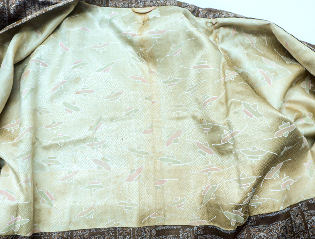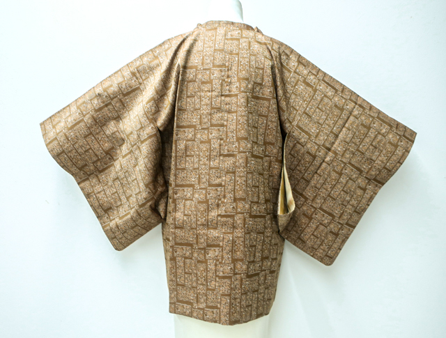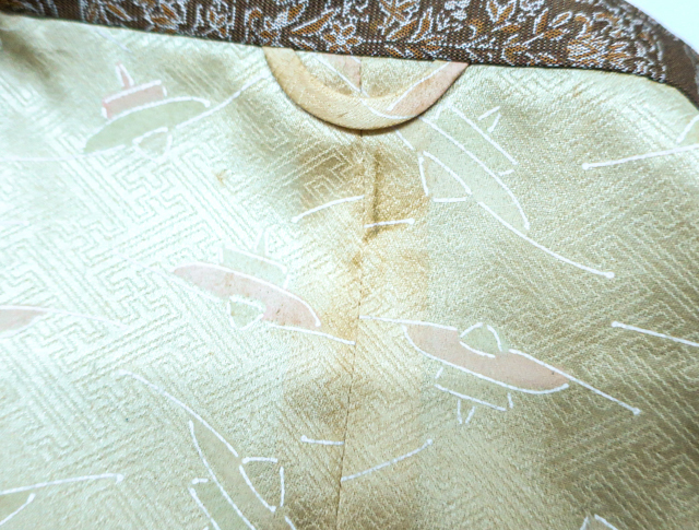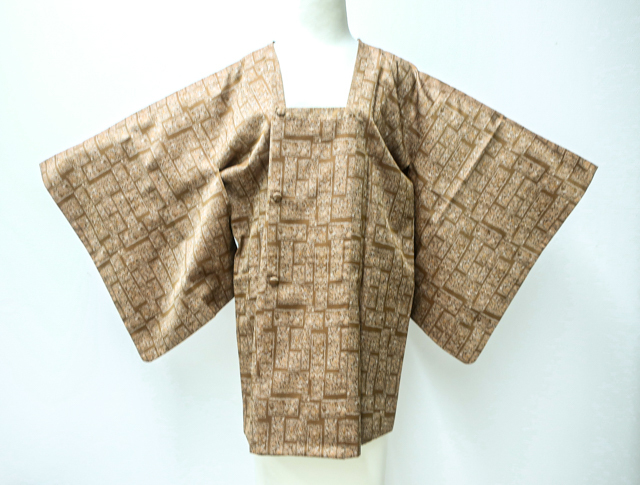 リサイクル商品のため、裏地にシミ、左後袖に汚れがございますが着用可能なお品です。 地色は、薄茶色です。 1枚目の画像が近いお色かと思われます。 素材は正絹です。 |