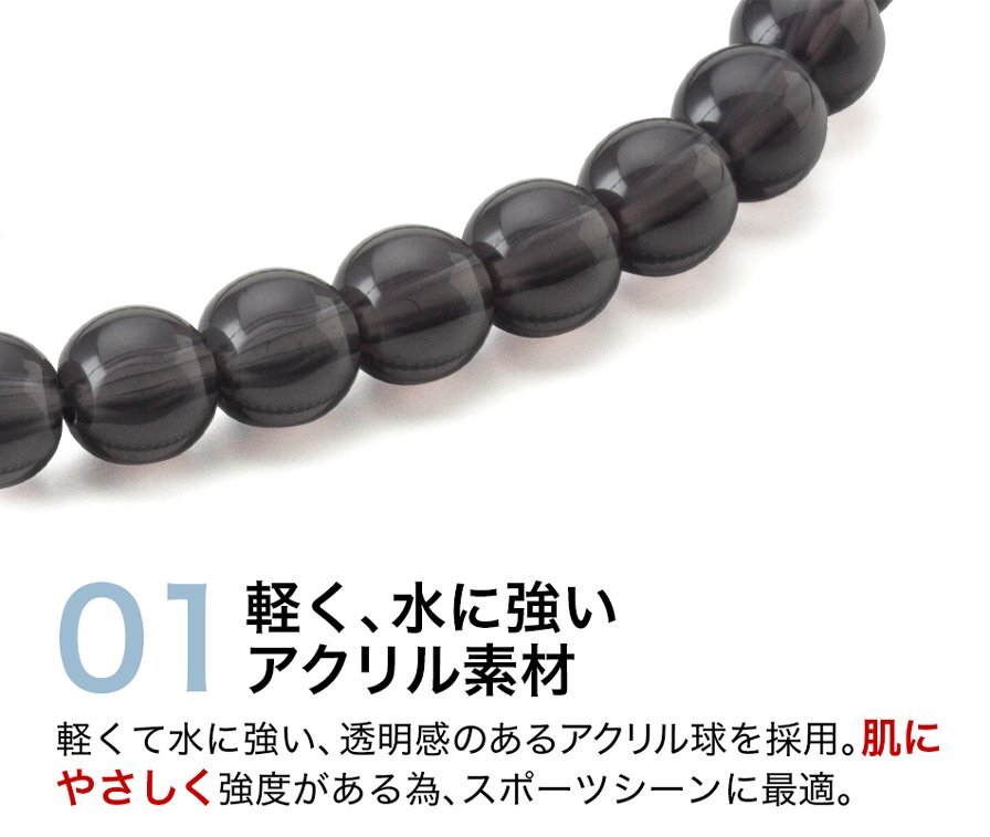 軽くて水に強い、透明感のあるアクリル球を採用。肌にやさしく強度がある為、スポーツシーンに最適。