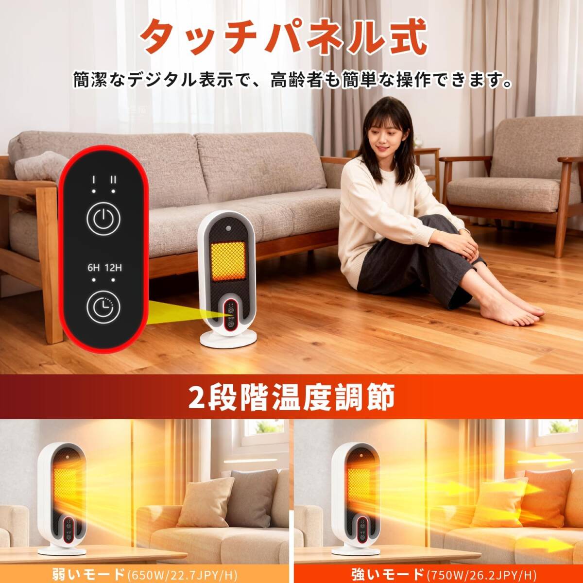 【2秒で速暖・2段階調整・超省エネ】セラミックヒーター は高品質な安全性高いPTCセラミック加熱素材を採用し、スイッチONで温風モードに切り替えてすぐ熱が出ます。待ち時間なしで電気ストーブ から暖かな風が吹き出しますので、朝の身支度や、帰宅直後など、すぐに暖まりたいというときにピッタリです。また、小型ヒーター は2段階の温度調節10畳のお部屋も素早く暖めます。1段目弱いモード(650W/22.7JPY/H)、2段目強いモード(750W/26.2JPY/H)で寒い冬も楽々乗り切れます。環境にも財布にも優しいセラミックヒーターです。寒い季節には、部屋の隅々まで素早く効果的に熱を満たし、すぐに快適な暖かさを感じられます。部屋の隅々まで素早く効果的に熱を満たし、すぐに快適な暖かさを感じられます。