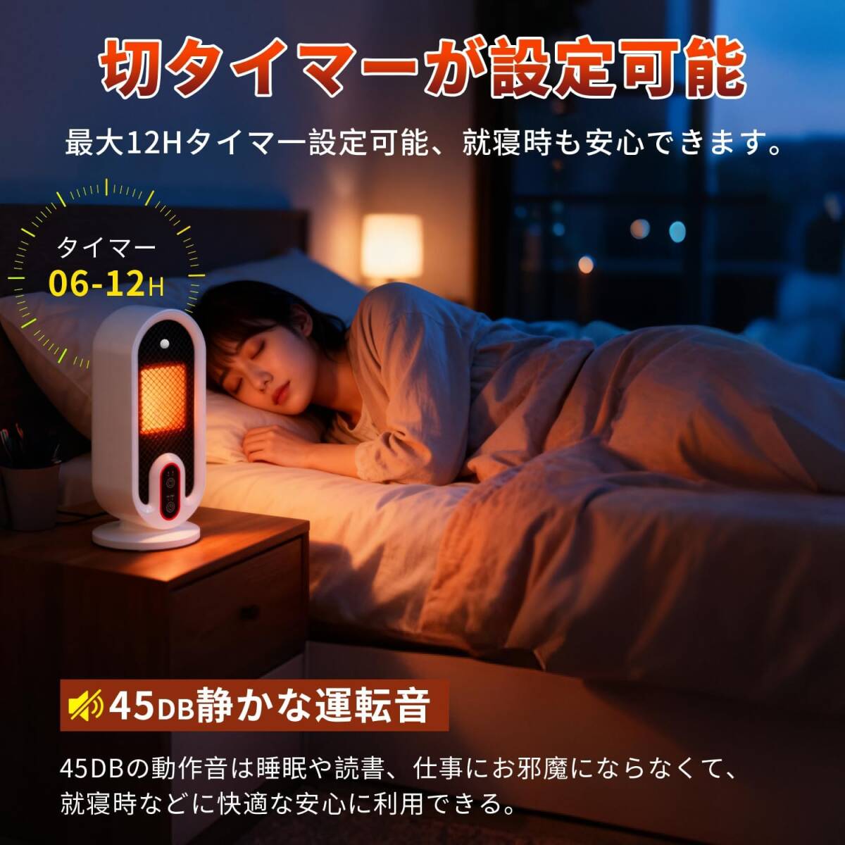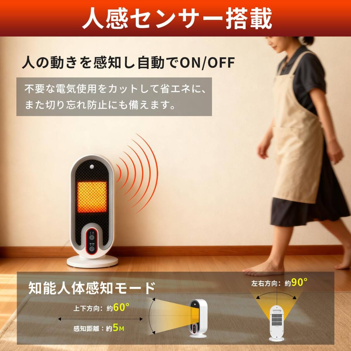 【2025最新進化セラミックヒーター、人感センサー機能付き】日本市場で大好評の『人感センサー機能』を搭載しています。人の動きを検知して自動運転/停止し、もし2分間以内に人体を検知できない場合、小型 ヒーター は自動的に電源を切ります。この人感機能は、他の製品の赤外線センサーよりもより高い感度を持ち、より正確に人体を検知することができます。節電しながら煩わしい操作を解消して、省エネ効果をさらに強化しました。