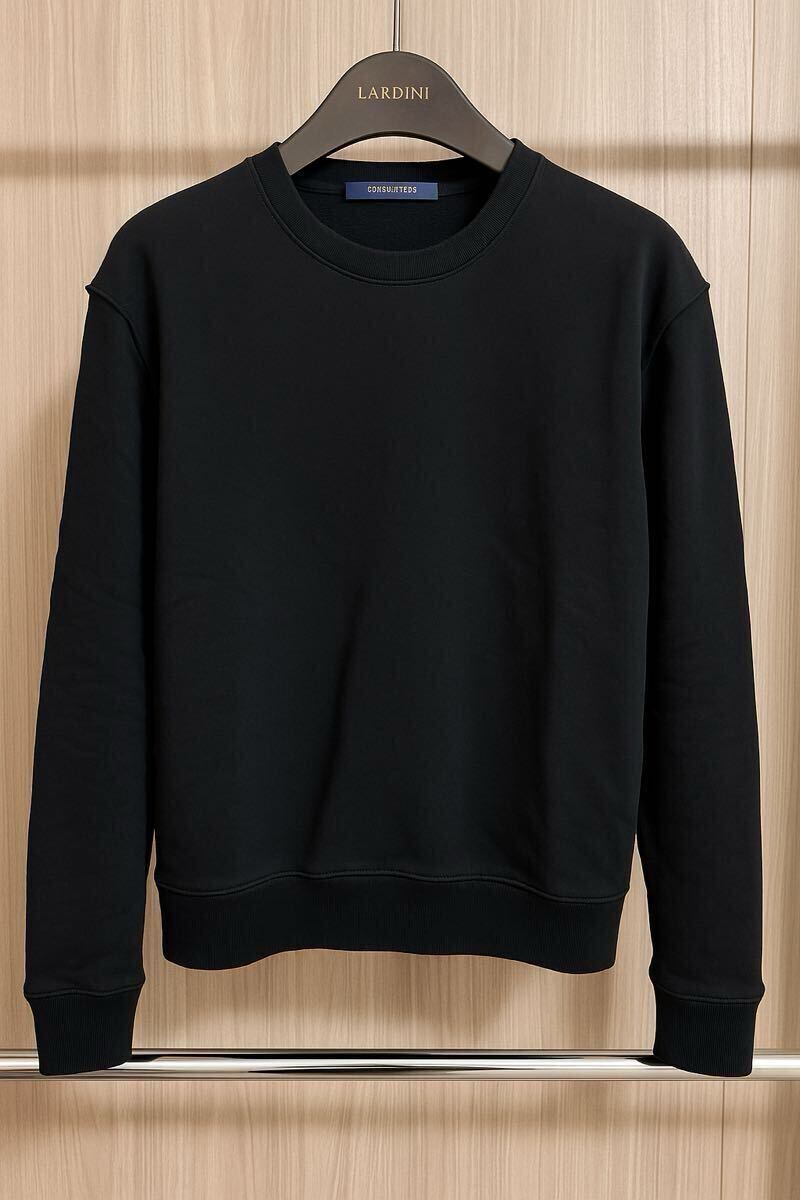 ・肩のラインに自然な落ち感があり、着丈はやや短めで スウェットとは思えない上質なシルエット