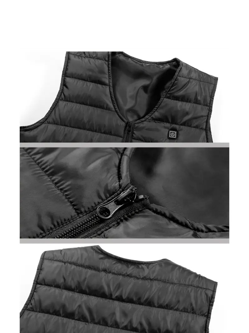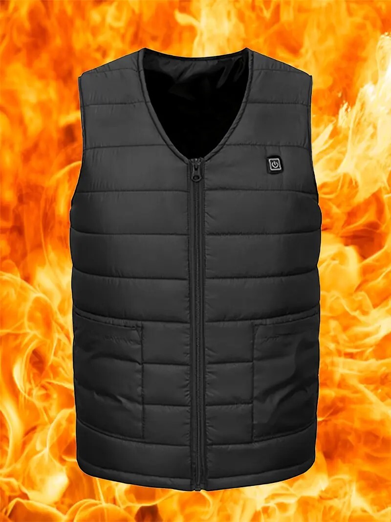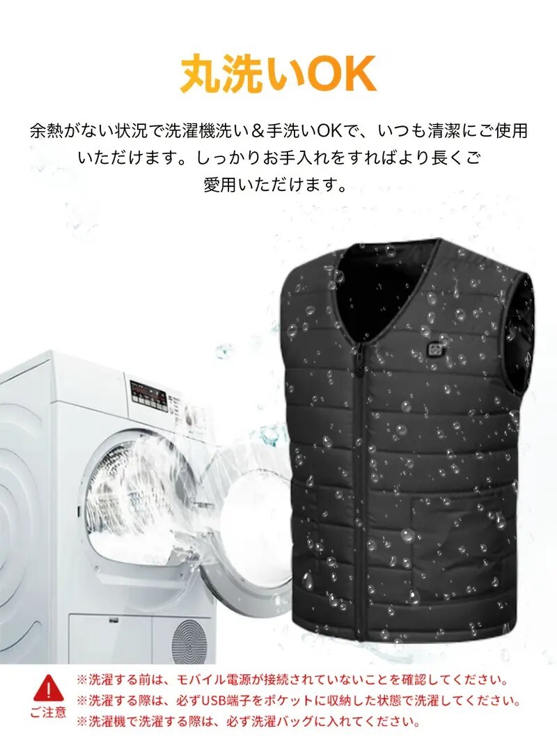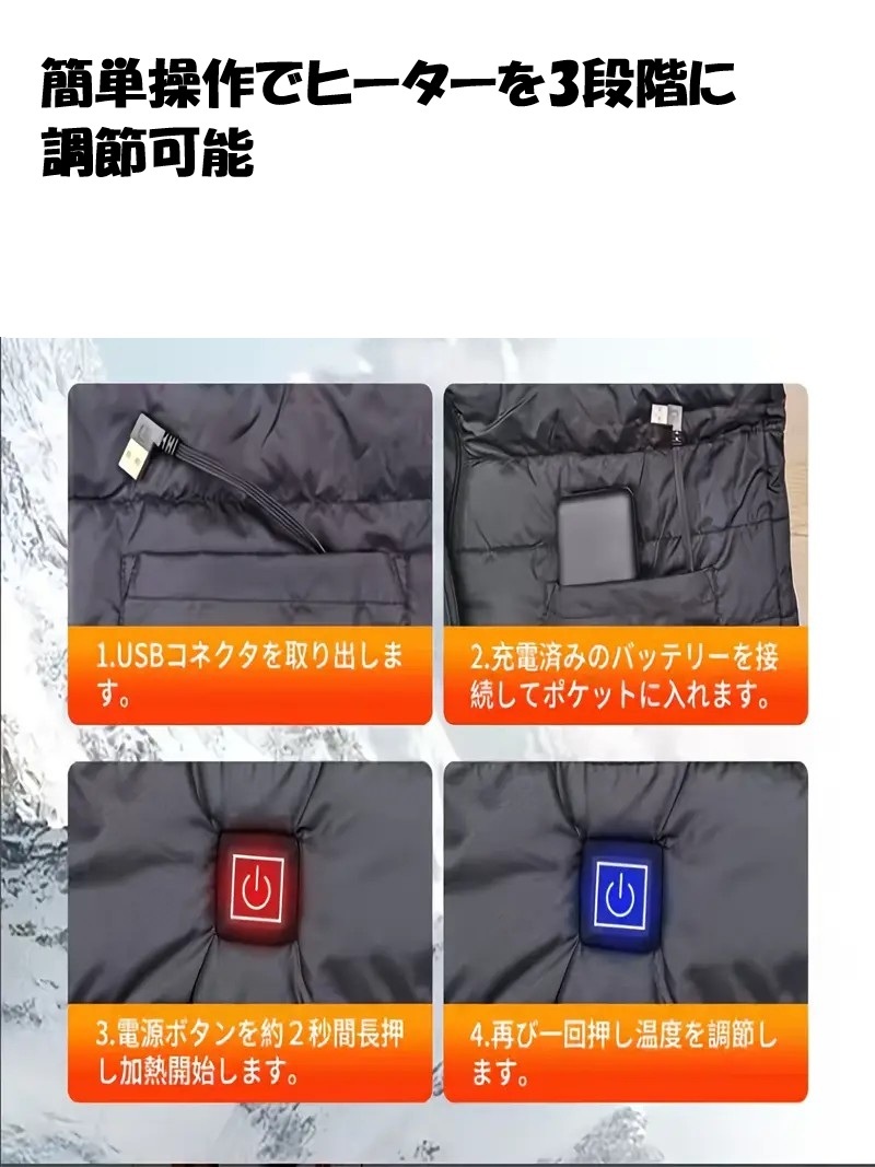 マイクロカーボンファイバーを使ったヒーターを肩、腹部、背中や襟首に設置し、冷え切った体をすぐにぽかぽかにできる電熱ウェア。