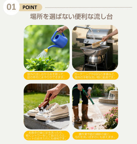 • 【場所を選ばない便利な流し台】○屋外の流し台から水を取って、庭の草花に水やりができます。○ガーデニングやBBQの準備など、屋外の手軽な洗い物に最適です。○お散の後に足を洗ったり、軽くシャワーをしてあけたりと、ペットのお手入れにも便利です。○農作業や庭の掃除の後に、汚れを洗い流すのにも使えます。