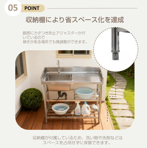 • 【収納棚により省スペース化を達成】二層収納棚が付属しているため、洗い物や洗剤などはスペースを占用せずに保管できます。脚部にカタつき防止アジャスターか付いているので傾きがある場所でも微調整ができます。