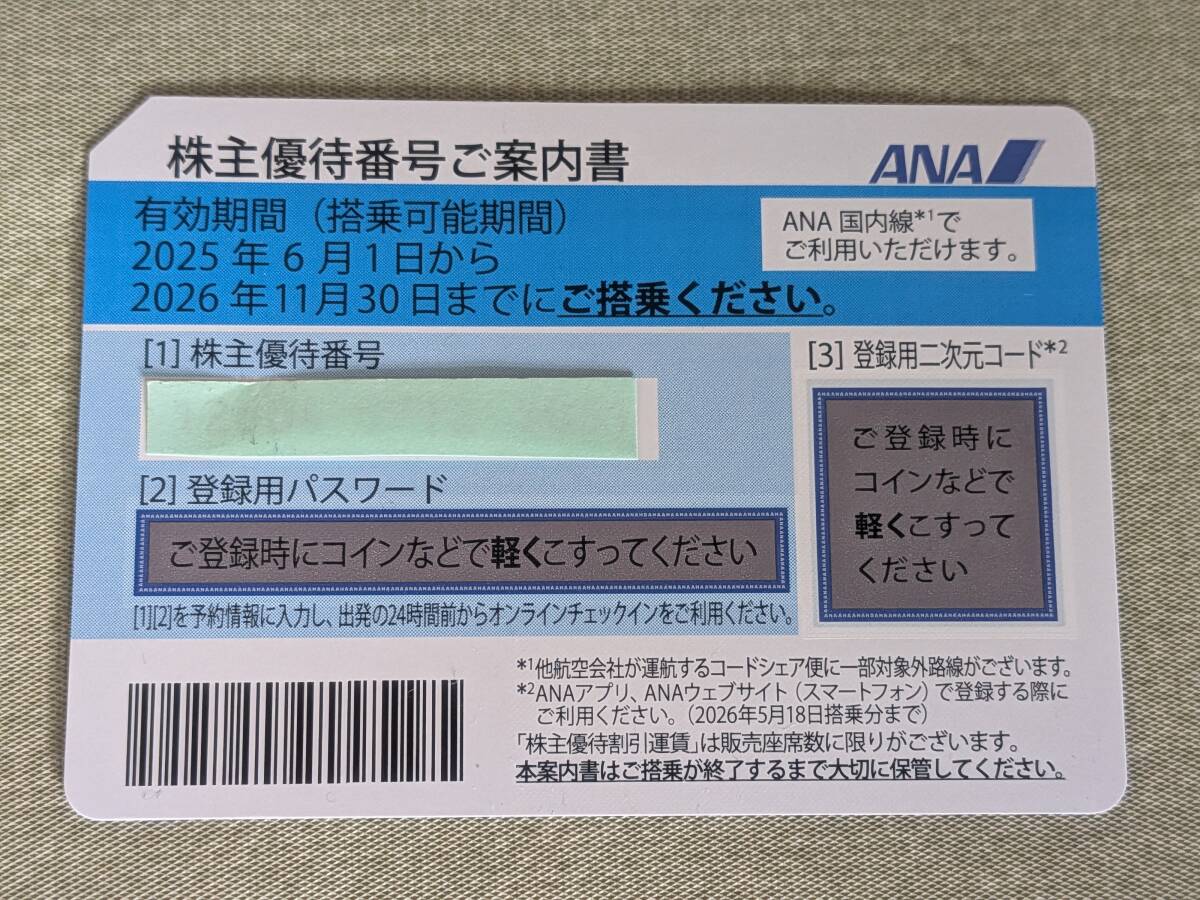 ANA 株主優待券 番号通知のみ 有効期限 2026年11月30日まで