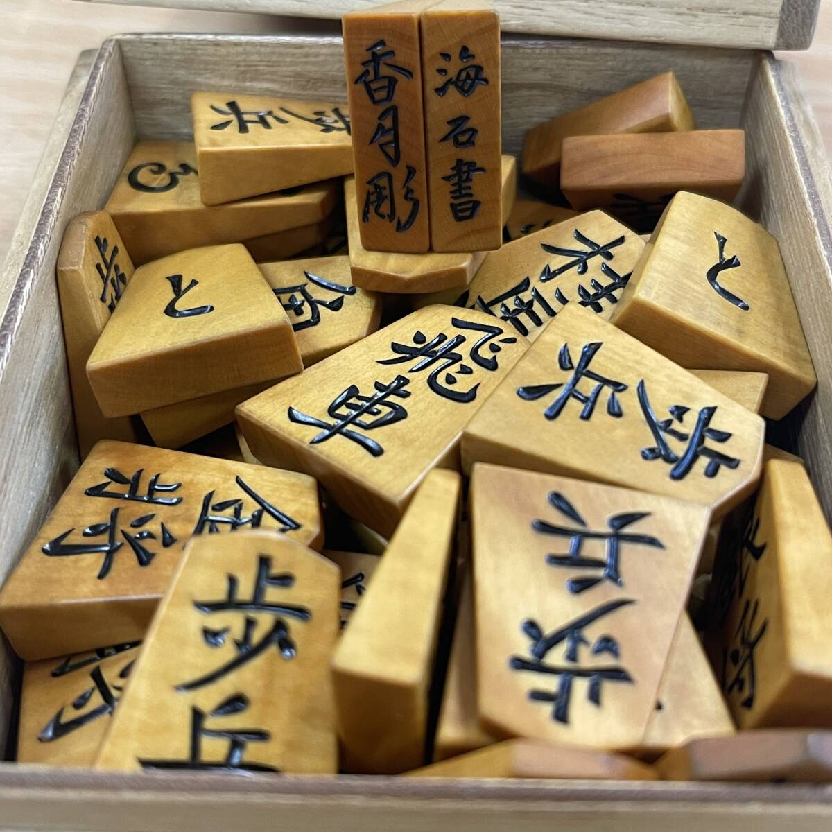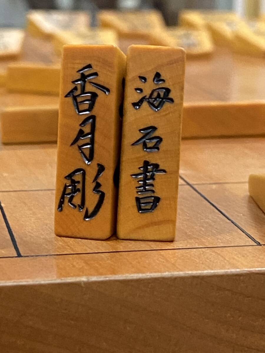 | 2 将棋駒 香月彫 海石書 彫駒 彫埋 42枚 歩兵あまり駒2枚付き 高級品 黄楊 当時物 | ||