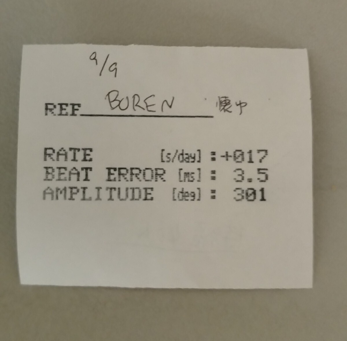 精度が印字されたペーパーには、日差+17秒、持続時間は40時間とあります。