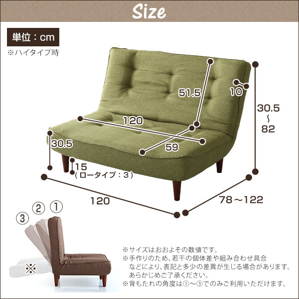 【カラー】 ブラウン、グリーン、グレー、ネイビー、ターコイスブルー 【サイズ】 外寸:幅120x奥行き78~122x高さ30.5~82cm 座面高:30.5cm 脚の高さ:15cm 【重量】 16kg 【素材】 構造材:スチールパイプ クッション材:ウレタン(モールド成型)、ポケットコイルスプリング 脚部:ポリプロピレン 生地:ポリエステル100% 【梱包】 サイズ:120x120x20cm、重量:18kg 【完成品】 脚のみお客様取り付けになります。 【ご注意】 ・サイズ、重量は概算です。 ・商品カラーはご使用のモニターによって実際の明るさや色と異なって見える場合がございます。 |