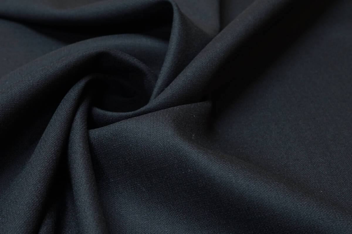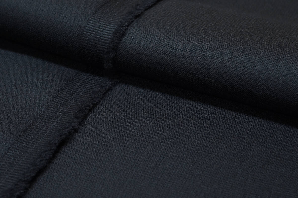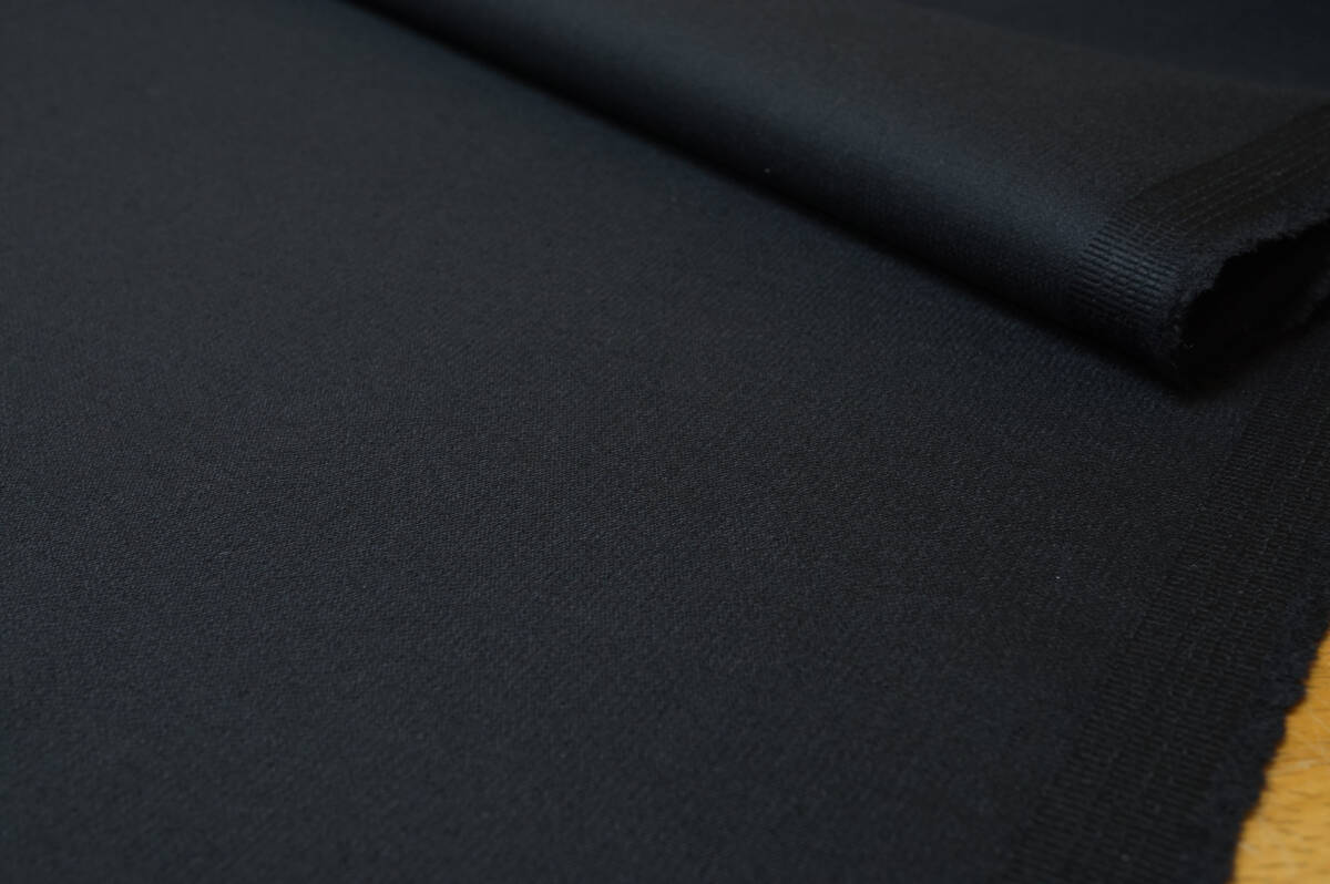 ヴァージンウール98%・ポリウレタン2%、微厚~中厚、しっとり滑らかな手触りと柔らかさ、控えめなツヤ感、巾方向に伸縮性、ストレッチ服地のトップブランドならではの質感、色調:ブラックでございます。