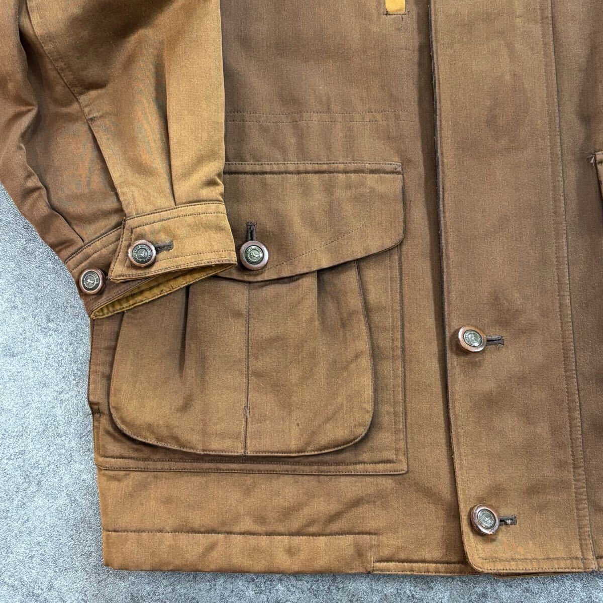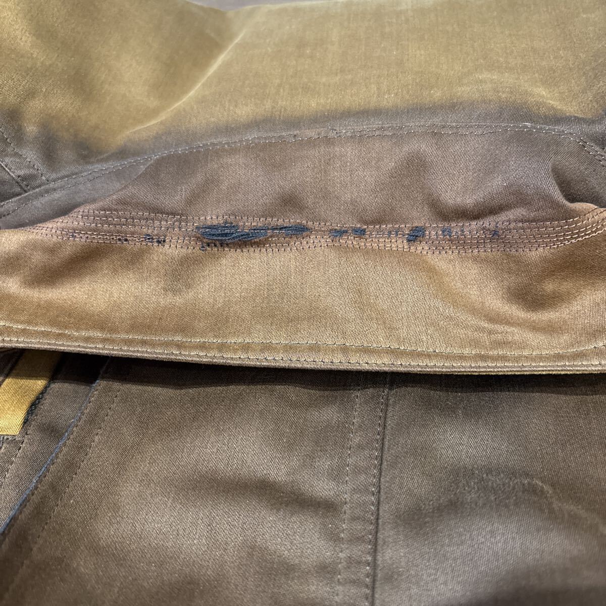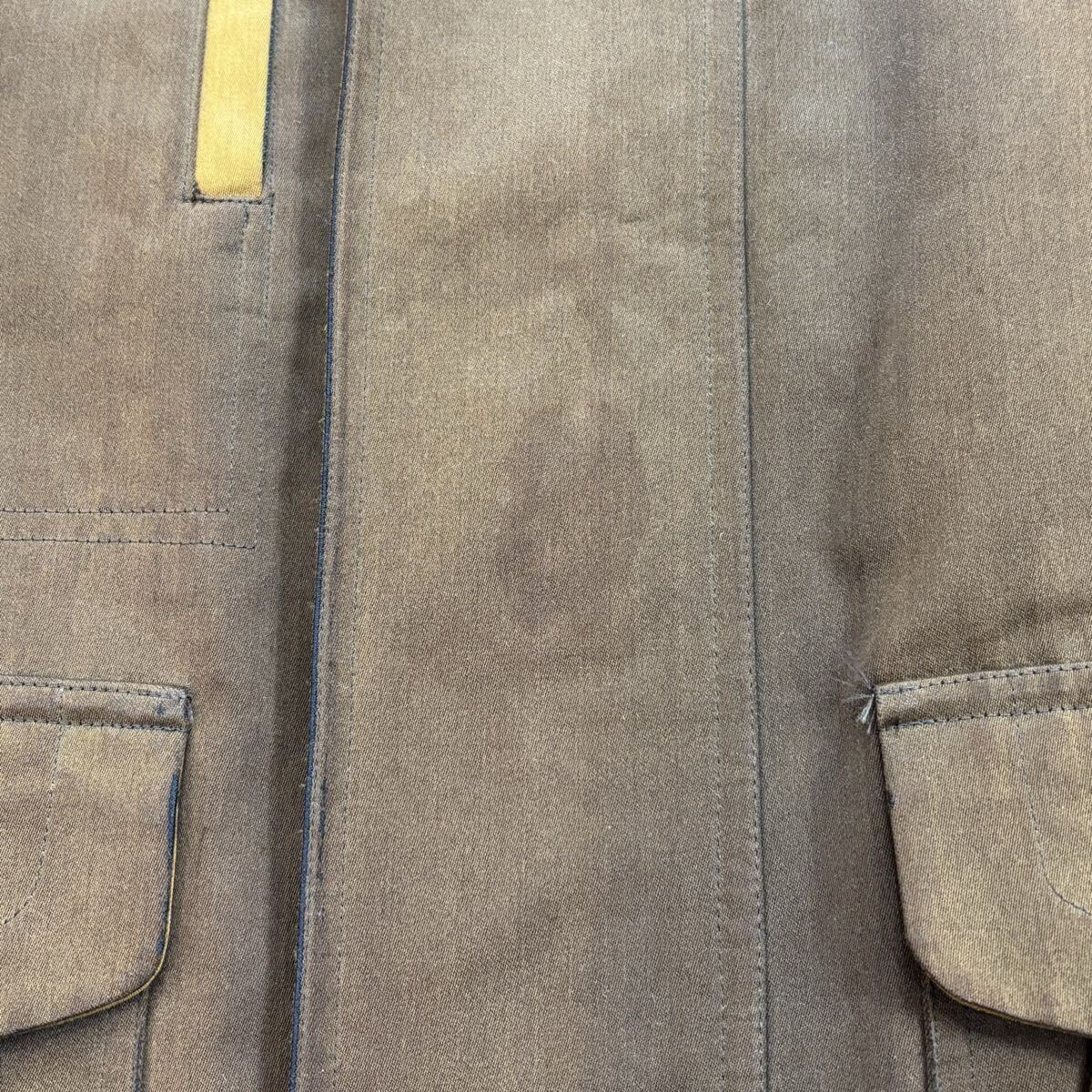 →全体的に多少の色褪せがあります。襟内側部分に多少の生地の使用感がありますが、着用の際は隠れるため問題ありません。正面身頃付近には多少のシミ汚れがあります(写真参照)。