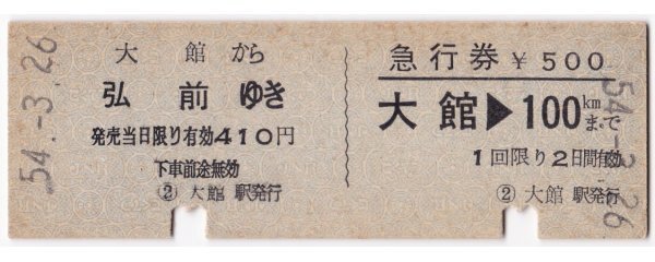 ●国鉄●【 大館から弘前ゆき・急行券 大館→100kmまで (一葉券) 】D型券 昭和54年 奥羽本線 大館駅発行【00864】秋田