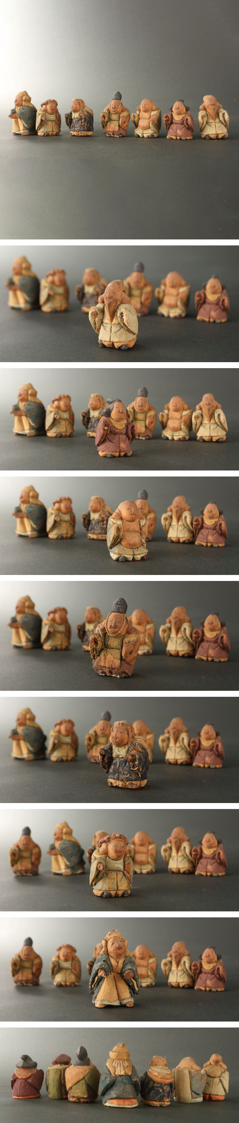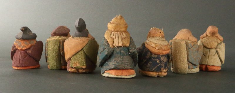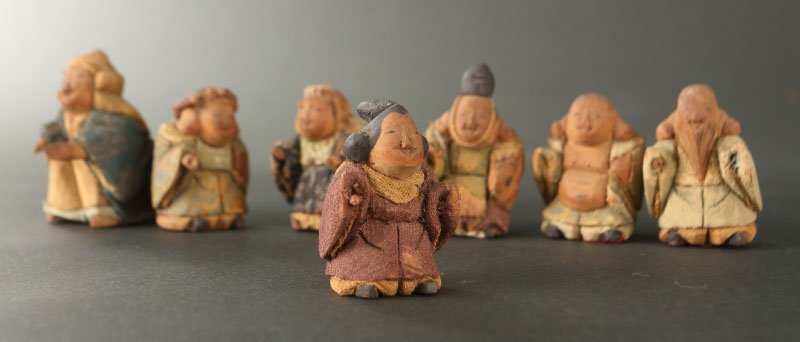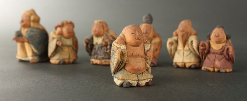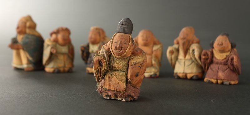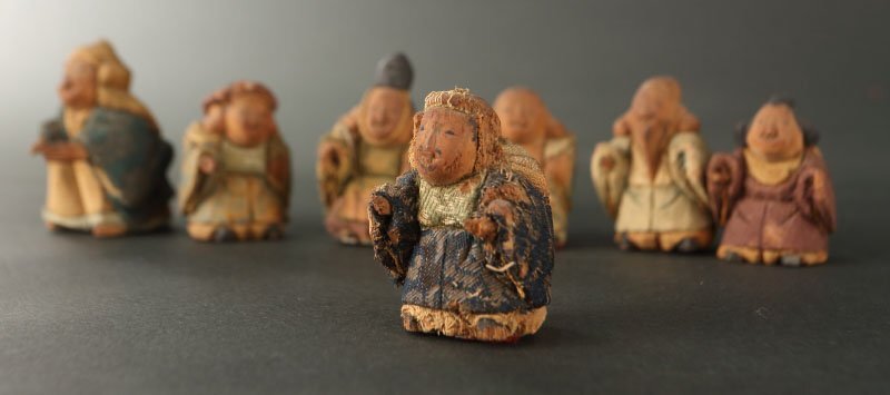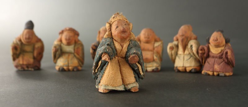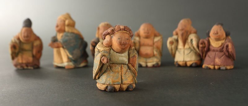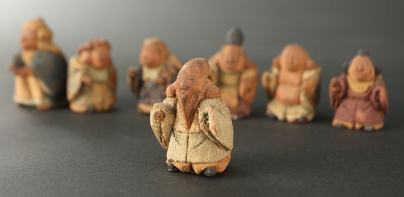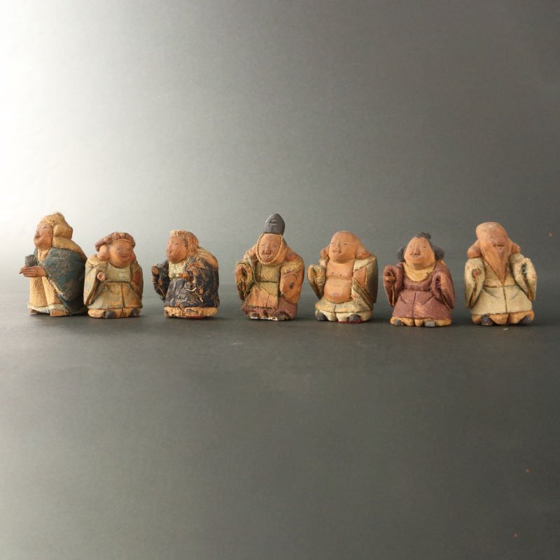 | 18~19世紀の賀茂人形です。 七福神を象った人形です。賀茂人形は元文年間(1736~1740)の上賀茂神社雑掌・高橋忠重により、葵祭にもちいる「柳筥(やないばこ)」の余材と神官の装束裂を組み合わせ創始されたといわれます。当時の御所や公家への贈答品として好評を博し、孫・大八郎の活躍した幕末期に最盛期を迎えました。 然しながら、高橋姓の人物は社家、同時代の賀茂社の文献に見えず、賀茂人形の発祥についてはいまだ謎が多く残っております。高橋忠重説の初出と見られる明治36(1903)年の猪熊浅麻呂『旧儀装飾十六式図譜』では、「元文四年に、賀茂別雷神社々家下役人になりし高橋忠重と云ふが、本国なる丹波国小塩村に住せし時、筥柳にて、人形を作る事を工夫せり、これこの人形の濫觴なり」と記されており、忠重の出自(坊官、職人、大工)や「賀茂」とのかかわり(柳筥、賀茂川の堤柳)など諸説が派生していったと考えられます。 猪熊浅麻呂が記した「丹波国小塩村」は現在の京都市右京区京北小塩を指すと見られ、古くは禁裏御料の杣山であったことが知られます。付近の京北中江町には賀茂神社が現存し、高橋忠重は恐らくは雷除に信仰された賀茂社とゆかりが深い木地師だったのではないかと推測されます。また、賀茂社では夏越祓で紙の人形(ひとがた)を流す祭事が古来行われており、もっぱら玩具として供された賀茂人形にも、皇族や公家の子女の健やかな成育を祈る古代の息吹が宿っていることが察せられます。 京人形の中でも古態を留める貴重な逸品です。 寸法:高さ5cm、幅3.5cm、奥行4cm(最大幅。若干の誤差はご了承下さい) 状態:経年感、虫喰い、布に破れ、カケがございます。 |