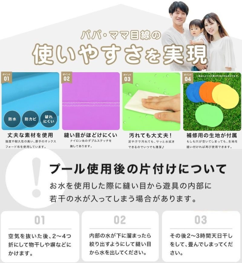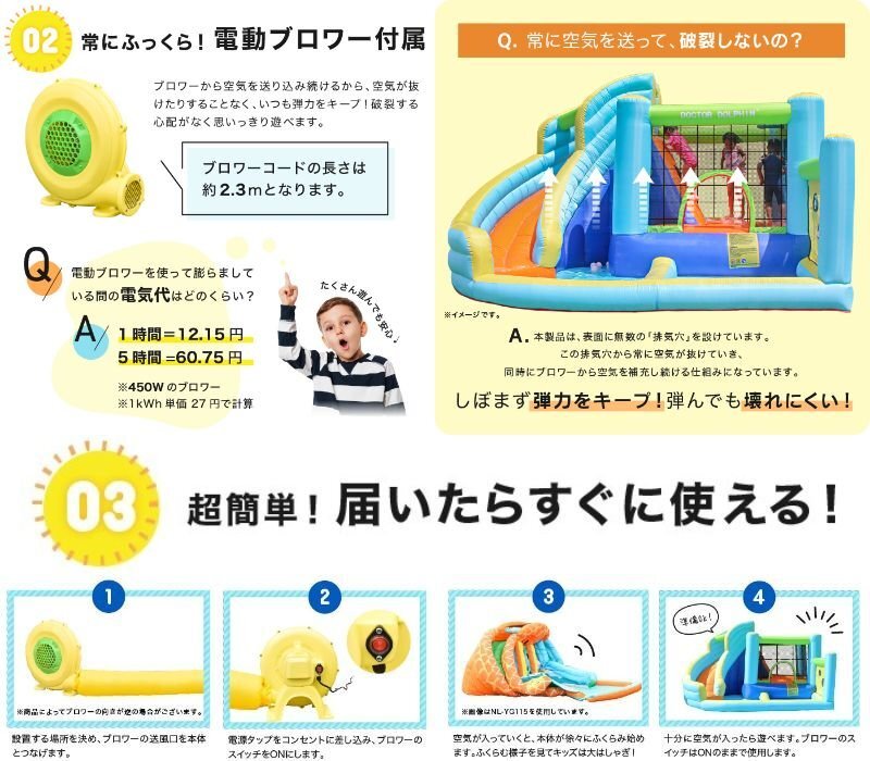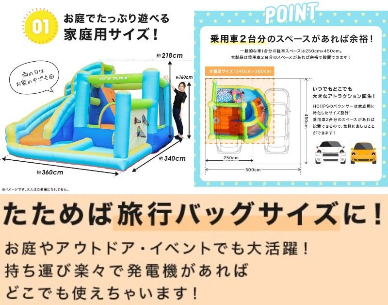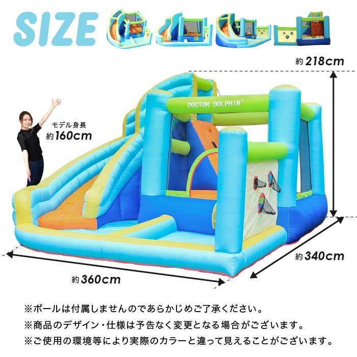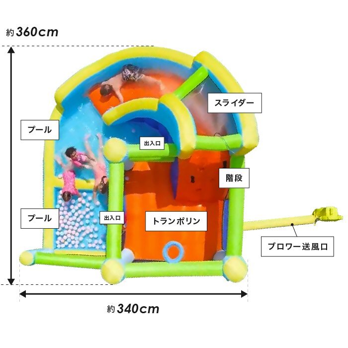| 商品説明 | 夏はウォータースライダー!冬はボールプールで365日楽しめる! キッズ大興奮の大型エアー遊具! セパレート式プールの登場! ロングスライダーはホースをつなげてウォータスライダーに!! トランポリンは飛び出し防止にネットが付いて居るので、思いっきり跳んでも安心 玉入れネット!バスケットゴール!で楽しさ倍増 大型の専用ブロアーも付属しているので、届いてすぐに遊べます ■ネットに破れがございますが使用に問題はありません。画像にてご確認ください。 ■本体サイズ:約W3,600×D3,400×H2,180(mm) ■本体重量:約14.9kg ■素材 滑り面:480Dオックスフォード布、その他:420Dオックスフォード布、ブロワー:PP他 修理品につき傷や汚れがございますが使用に問題はありません |