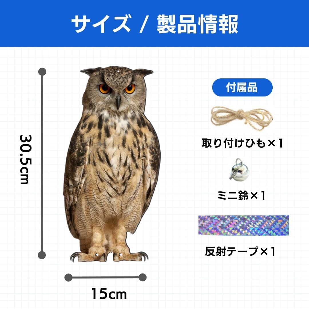 【鳥よけ・鳩よけの対策グッズ】鳥獣被害にお困りの方におススメの吊るすだけの鳥よけグッズです。鳥よけ、鳩よけ、カラスよけなどの対策として効果を発揮します。 【リアリティのあるデザイン】鳥類の天敵となる鷹やフクロウの絵柄がリアルティあるデザインで描かれています。また、反射帯と鈴が付いているため、鳩やカラスなどの鳥類を追い払うことができます。風が吹くことで発生する反射光や鈴の音は、鳥を傷つけることなく驚かすことができます。 【防水性の丈夫な素材を使用】変形しにくく、両面プリントタイプで模様がより鮮明になっています。防水素材のため水滴にも耐久性があり、雨の日でも使用することができます。強風でも壊れにくく直射日光にも耐えらるので長く使用できます。 【様々なシーンで活用できる】ベランダや庭先だけではなく、生活に関わる様々な場所で使用することができます。庭園、果樹園、玄関先やオフィス、駐車場などでの使用、ゴミ捨て場、農園、神社、公園など、鳥が集まりやすい場所であれば、効果的にご使用いただけます。 【サイズ・スペック】「サイズ」:(鷹A) 縦=30.5cm×横=21.8cm、(鷹B) 縦=30.5cm×横=26.3cm、(フクロウ) 縦=30.5cm×横=15cm 「カラー」:取り付け紐×1、ミニ鈴×1、反射テープ×1 【30日間の返品付き】ご購入日から30日以内であれば無償にて返品・交換の対応をさせていただきますので、安心してお買い求めください。品質管理には万全を期しておりますが、万が一商品に不備がございましたら、恐れ入りますがカスタマーサポートまでメールにてご連絡ください。
