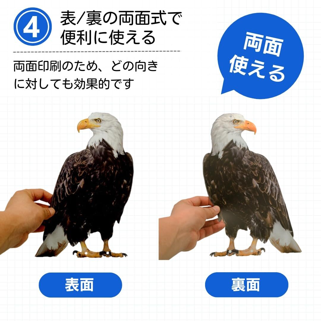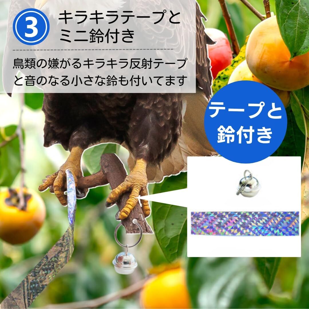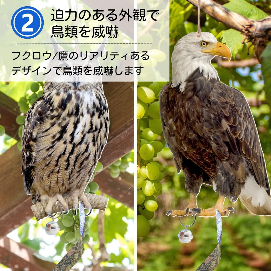 【リアリティのあるデザイン】鳥類の天敵となる鷹やフクロウの絵柄がリアルティあるデザインで描かれています。また、反射帯と鈴が付いているため、鳩やカラスなどの鳥類を追い払うことができます。風が吹くことで発生する反射光や鈴の音は、鳥を傷つけることなく驚かすことができます。
