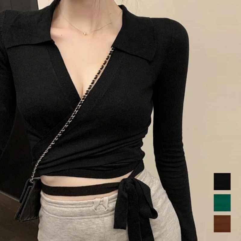 ラップデザインがオシャレ、ウエストマークでコーデが引き締まる格上げしてくれるカシュクールニットトップスです。