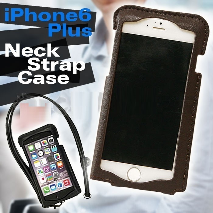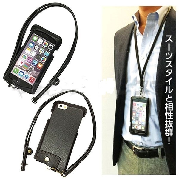 ☆1スタ iPhone6S Plus 対応 ケース ネックストラップ付 ブラック レザー調 ケース シンプル オフィス アイフォーンカバー iPhone6