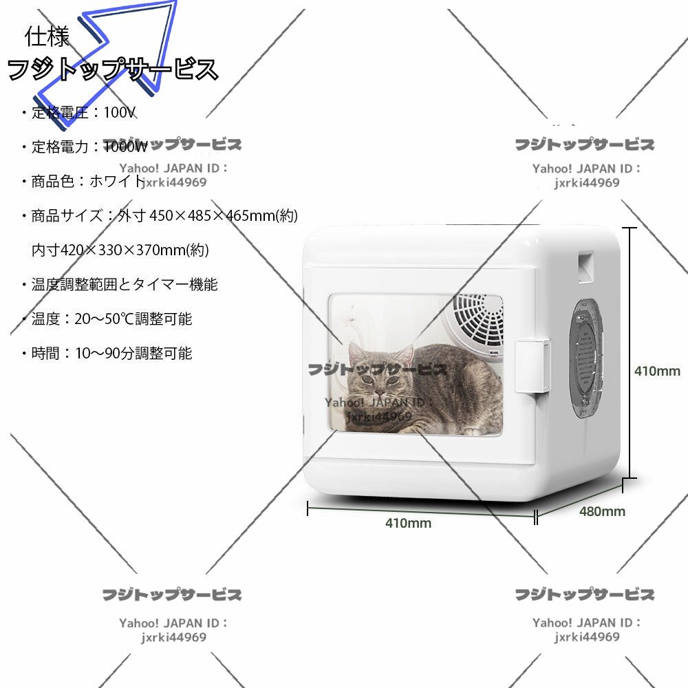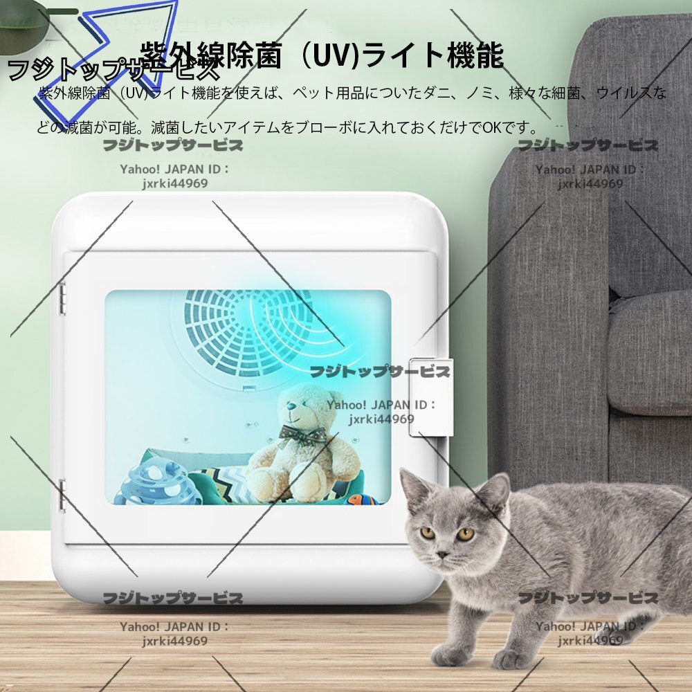 状態:新品未使用 ★安心していただける気持ちの良いお取引にしたいと思っております。 電 圧:100V/60Hz/55Hz 電 力: 1000W 温度範囲:20~50℃ 動作音:40db 時間設定範囲:~3時間 カラー:ホワイト 従来のドライヤーのブローは一転集中型だと、ペットの濡れた毛を隅々まで乾かそうとするとペットが動いて時間に手間も掛かります。ボックス型底面から温風を吹き込み、室内を360度循環させて立体的にペットの毛を乾かすので短時間でドライ完了。ペットが室内で動いても、隈なく循環する風で乾かし残しがありません。また濡れたペットは爪の間やお腹、脇の下の毛は他の部位より乾かし難く、乾かし残しがあると雑菌が繁殖して皮膚病の原因に。ドライハウスは乾き難いペットの下の部分から温風を送り込んで優先的に乾かすので、しっかり乾燥できます。 ドライハウスは濡れたペットを乾燥している最中でもペットの安全を確保するために安全装置付。人の目では確認できない室内の異常高温も、内蔵センサーで常に監視し、異常があれば自動的に電源がOFF。またドライハウスはイオン発生装置も搭載。そのため室内は常に衛生的です。さらに遊んでよだれが付いた玩具類や毛布、お散歩で使ったリードや衣装、食事で使う食器類など、ドライで使わない時にまとめてイオンで除菌・脱臭。ペットや飼い主を雑菌からしっかりガードし、健康維持に貢献します。 乾燥中のペットが室内で快適に過ごせる様々な工夫が施されています。室内の温度を1度単位で設定でき、夏は冷風、冬は温風でドライが可能。室内にはライトが点灯し、中のペットの様子をしっかり観察できます。またタイマー付きで、時間が来れば自動的にブローが終わり、飼い主が付きっきりにならなくても乾燥させ過ぎを防げます。さらに運転音はわずか40デシベルの静音設計。録音スタジオとほぼ同じ静けさなので、ブロー中もペットはすやすやお休みできます。 ドライヤーでブローをすると抜け毛が遠くへ飛んで散らばってしまいますが、室内循環送風のドライハウスではブロー後の抜け毛は集毛フィルターに集まります。ブロー後は抜け毛が溜まったフィルターをそのまま外せるため、そのままゴミ箱へポイ。フィルターを水洗いして乾かせば、すっきり綺麗にお掃除できます