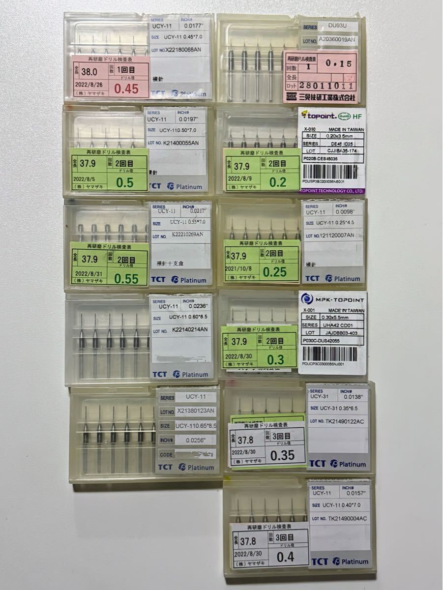 TCT Platinum製の極細超硬マイクロドリル110本の出品です。シャンク径φ3.175、各ドリル径1パック10本入りです。
