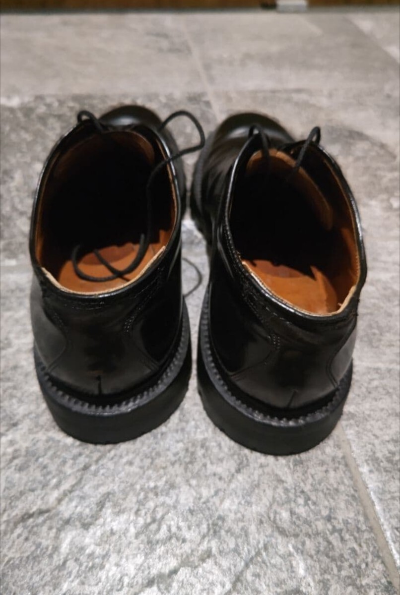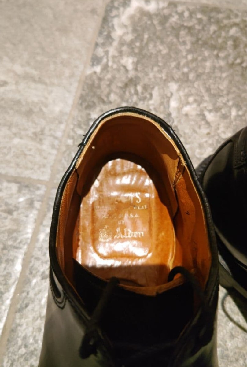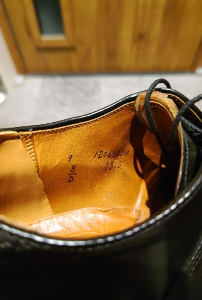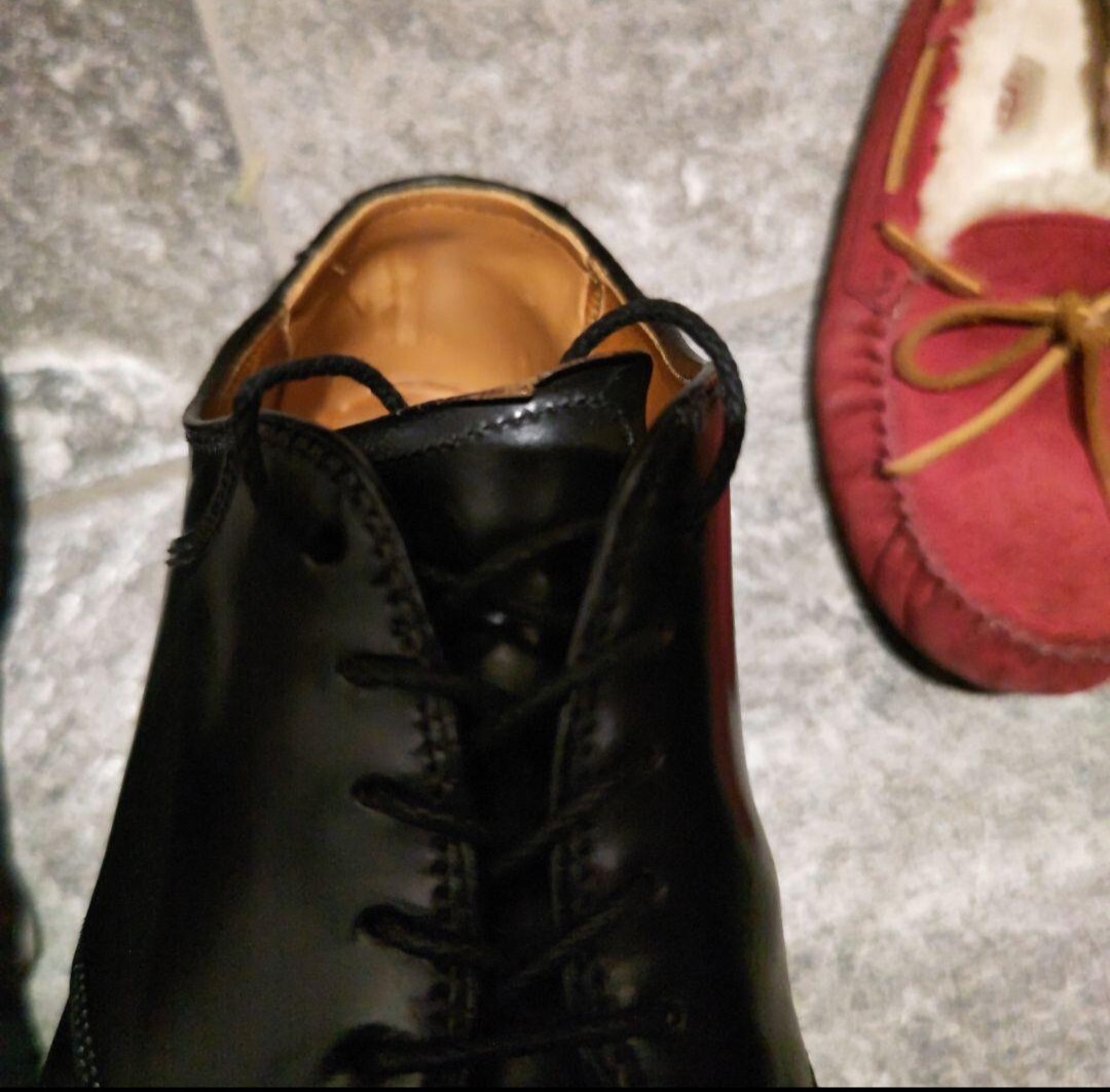 かかとの革が弱っていて内側から補修しています。あとタンが少し切れています。が、革はあまりキズなくめちゃくちゃ輝きます。