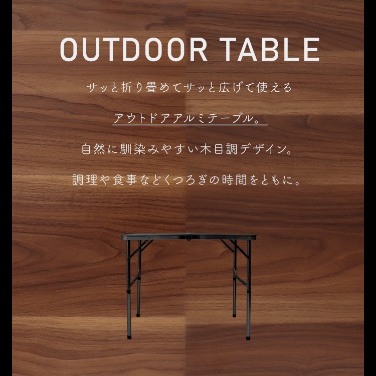 BBQやアウトドアに最適なコンパクトに折りたためるおしゃれなピクニックテーブル! 車のトランクに入れる時や持ち運びの際にもとても便利な取っ手付きで持ち運びもラクラク! サビに強いアルミを使用し、天板には防水加工が施されています。 テーブルは2段階の高さ調節ができ、お好みのスタイルに合わせて 「ハイスタイル」「ロースタイル」の2パターンでお使いいただけます。 天板中心部にはパラソル用ホールがあるので、ベランダやテラスでの使用にもおススメです。 キャンプ、バーベキュー、お花見だけでなく、 スポーツ観戦や運動会、イベントごとにも最適なサイズ感なので、汎用性も抜群です! 【商品仕様】 ・折りたたみ式 ・テーブルサイズ(約):幅90cm×奥行60cm×高さ39cm/72cm ※高さ2段階調節 ・カラー:ダークウォルナット ・収納サイズ(約):幅62cm×奥行6.5cm×高さ47cm ・パラソル用ホール直径サイズ(約):26mm ・材質:アルミ、MDF(耐熱・耐水加工)、ポリエステル、スチール ・重量(約):4.0kg |