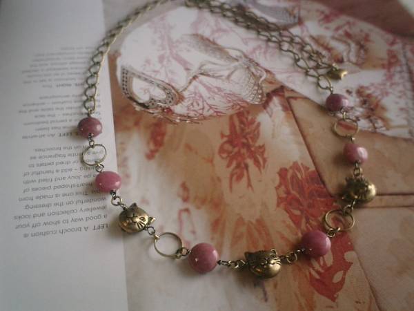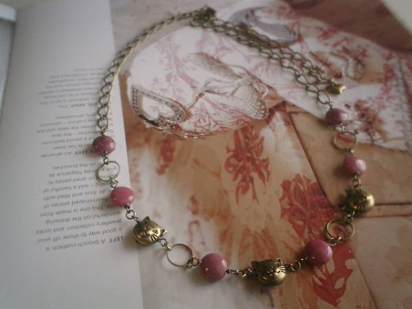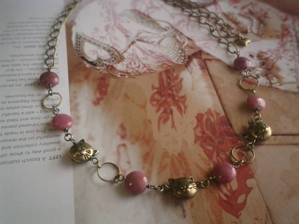 ロゼッタの宝石箱・・シリーズです♪おしゃべりな猫さん・・キュートなロードナイトと猫さんのネックレスです♪10ミリのコインのロードナイトに10ミリ位の猫さんのメタルチャームを合わせました♪ダークピンクのロードナイトにお澄ましした表情の猫さんが素敵です♪♪長さは全長50センチ位で調節自由です。短くチョーカー風に着けても可愛いです♪お揃いのブレスレットも出品しています。ハンドメイドをご理解頂いてノークレーム、ノーリターンでお願いします |
