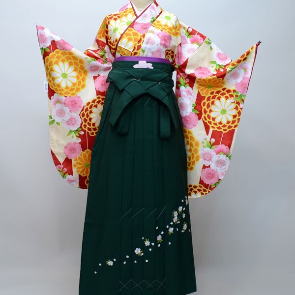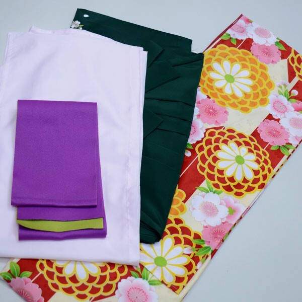 | セット項目 | 卒業式二尺袖着物袴フルセット ・二尺袖着物 ・二尺袖長襦袢(白地の半襟付き) ・重ね衿(着物についています) ・袴 ・袴下帯(リバーシブル両面使えます) ■半襟、袴下帯につきましては、モデル着用の物ではではなく、3枚目、4枚目に掲載されている商品になります |