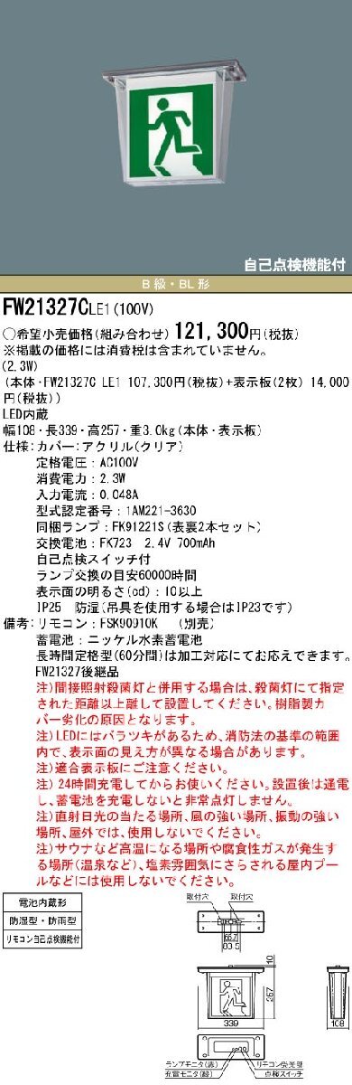 ◇LED誘導灯 【3台セット】天井直付型 パナソニック FW21317C LE1/FW21327C LE1 防湿型 防雨型 HACCP兼用 片面/両面 表示板別売 ※23年製