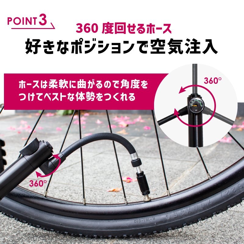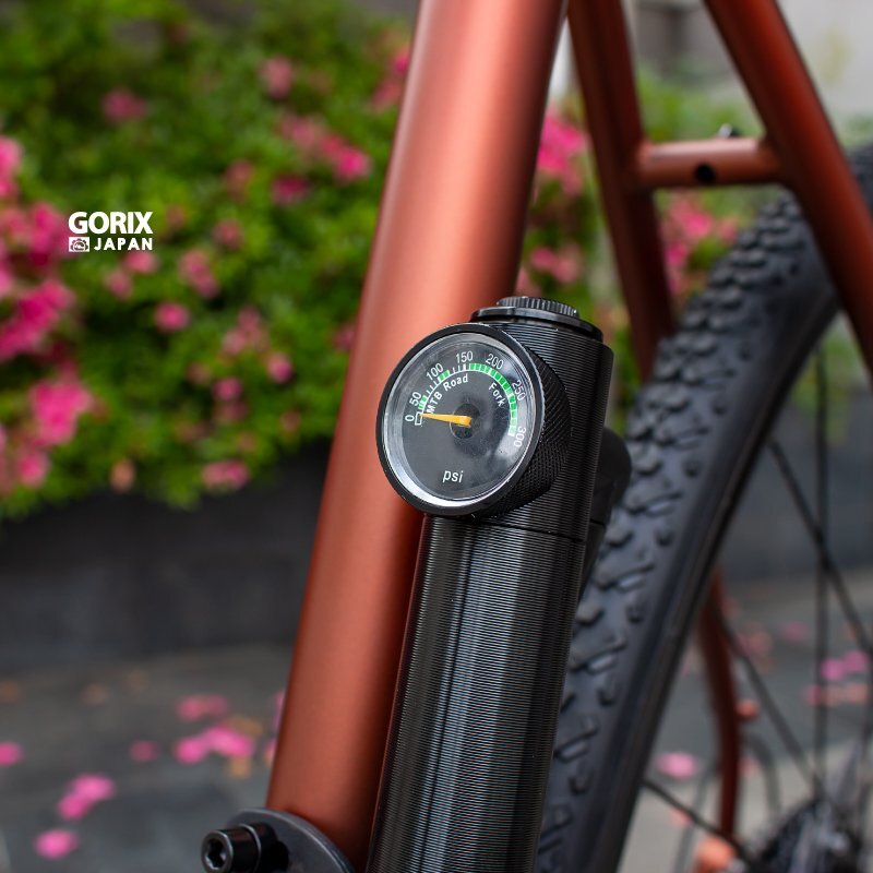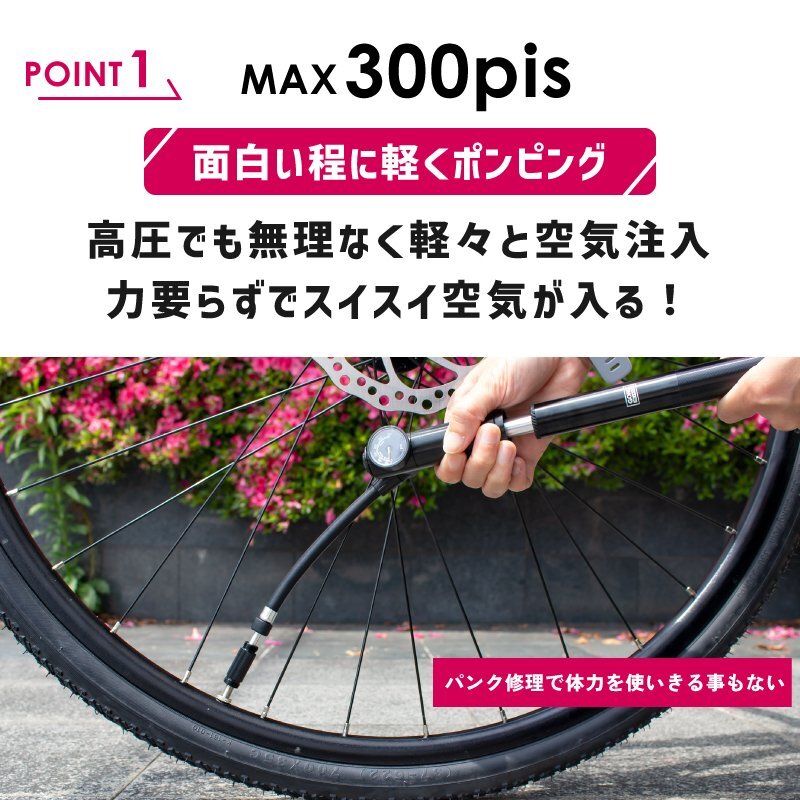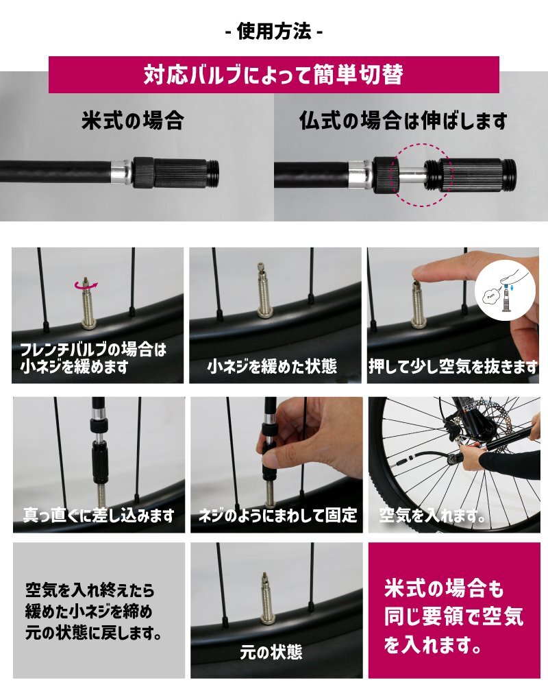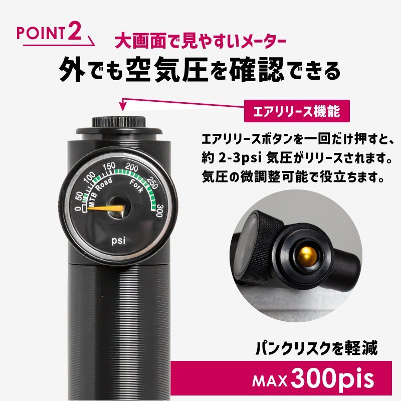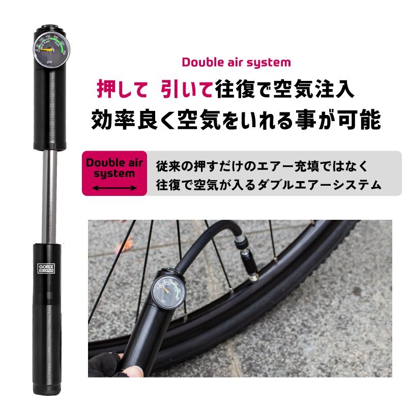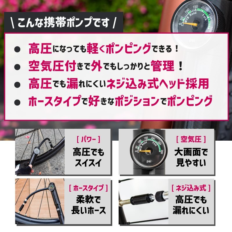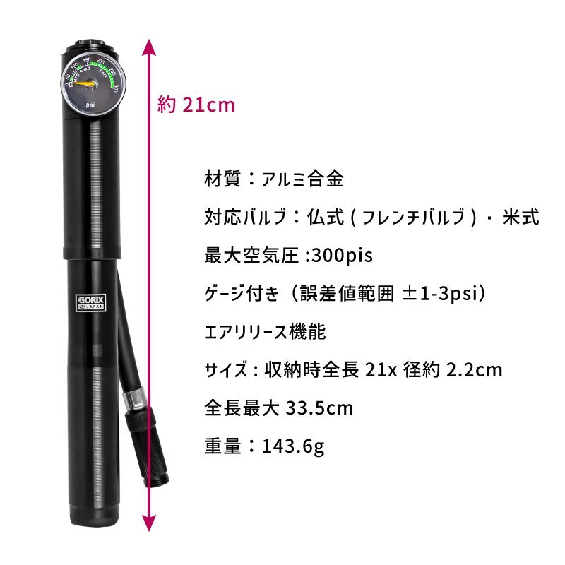 携帯空気入れでも軽々と高圧まで空気を入れる事が可能に。 最大空気圧300pisまで! 仏式と米式に対応しているのでロードバイクやクロスバイク、ミニベロ、マウンテンバイク、エアサスなどの携帯用ポンプにおすすめです。 高圧でも空気が漏れにくいねじ込み式ヘッドを採用。 米式と仏式の切替も回して伸ばすだけととても簡単! 空気圧を確認しながらポンピングできるので分かり易い。 コンパクトで軽量なので携帯性に優れています。 ツールケースに入れたり、付属のブラケットを使って車体に取り付ける事も可能。 商品内容自転車用携帯空気入れ、ブラケット、ネジ2本、ボールニードル 材質アルミ合金 対応バルブ仏式(フレンチバルブ)・米式 最大空気圧300pis ゲージ(誤差値範囲±1-3psi) エアリリース機能 サイズ収納時全長21x径約2.2cm 全長最大33.5cm 重量143.6g | |
