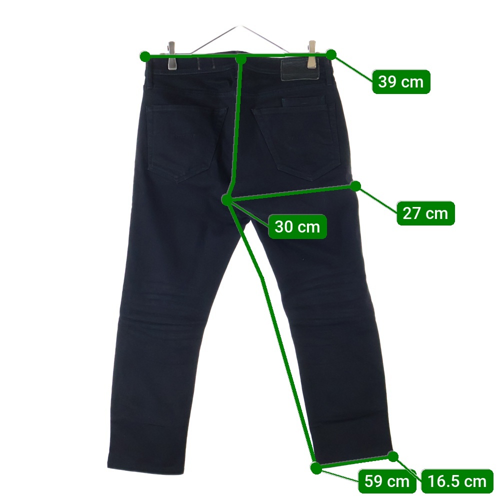 実寸 ウエスト:39センチ ワタリ:27センチ 股上:30センチ 股下:59センチ 裾幅:16.5センチ