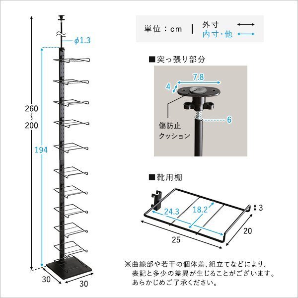 | 見せる収納の突っ張りシューズラック11段 お気に入りの靴を飾るディスプレイラックとしても、靴を収納するためのシューズラックとしてもお使いいただけます。 棚の高さ調節が可能なので、ハイカットやロングブーツでも容易に収納ができて便利です。 |