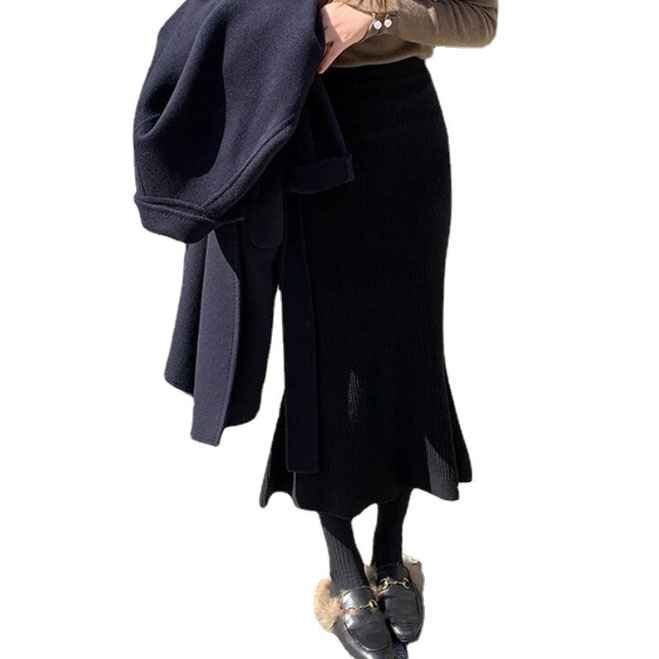 ・トレンドのマーメイドシルエットと縦線のリブが脚長効果。バックスリットで大人ぽい印象です。
