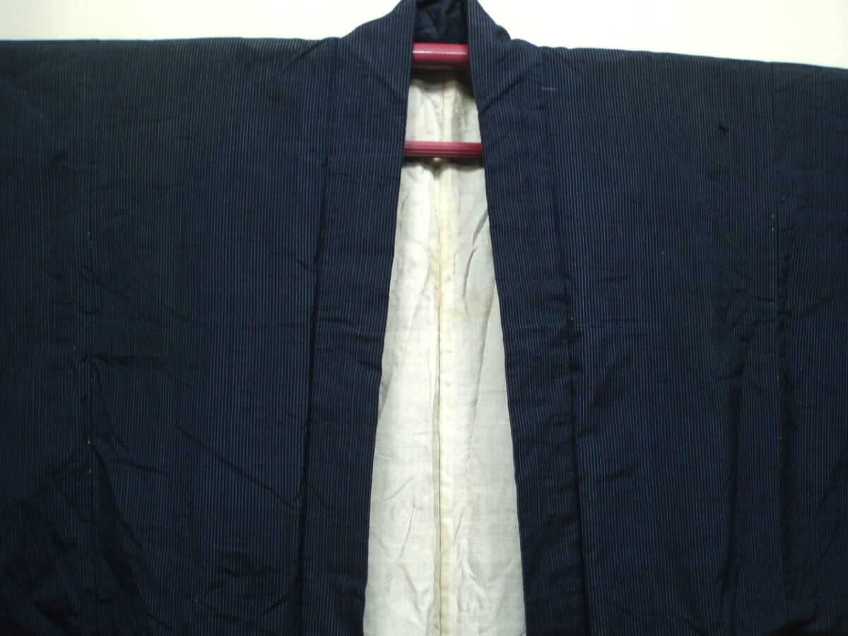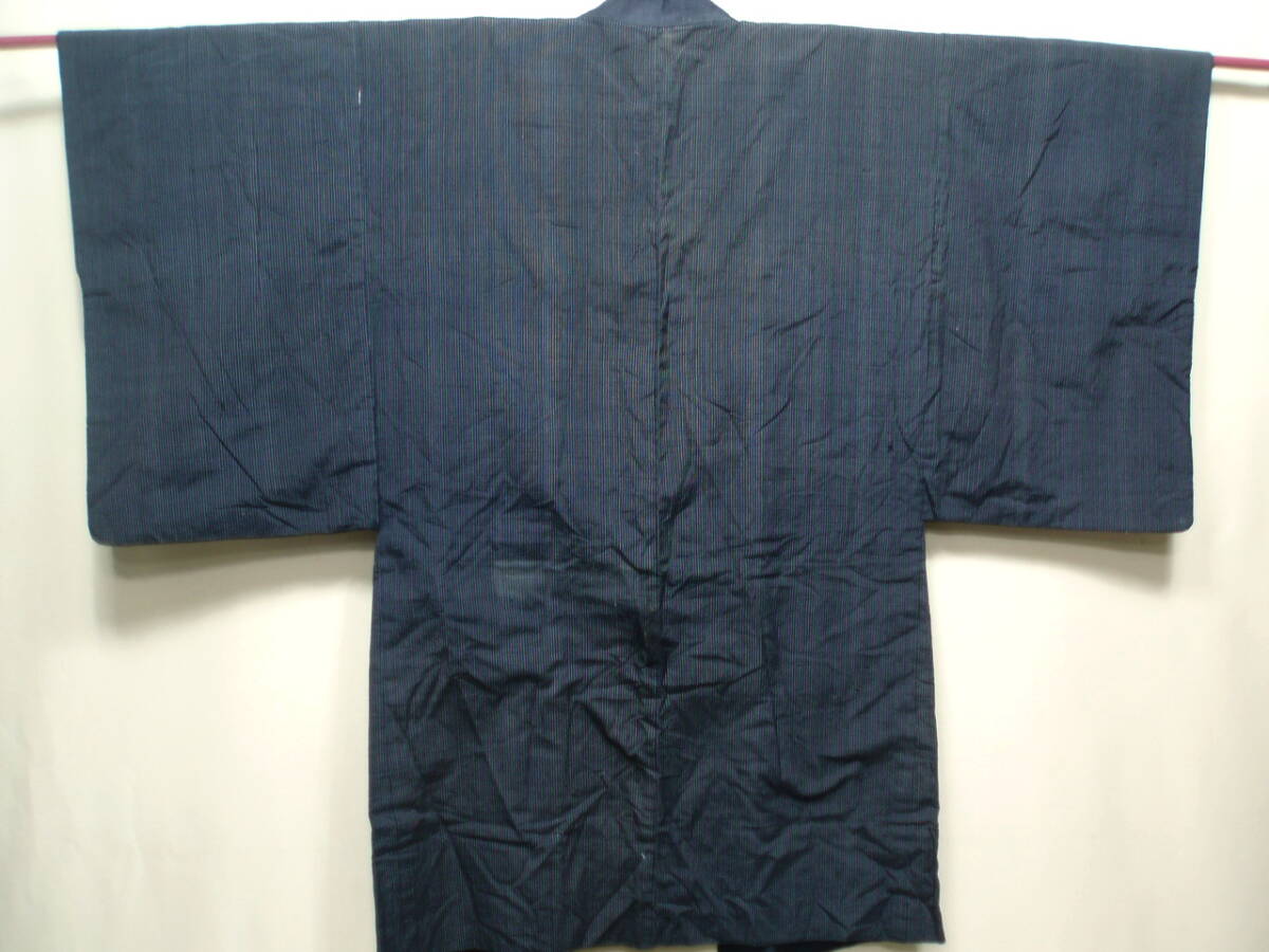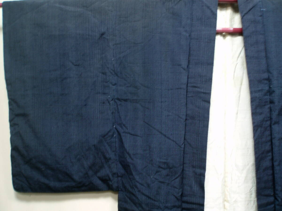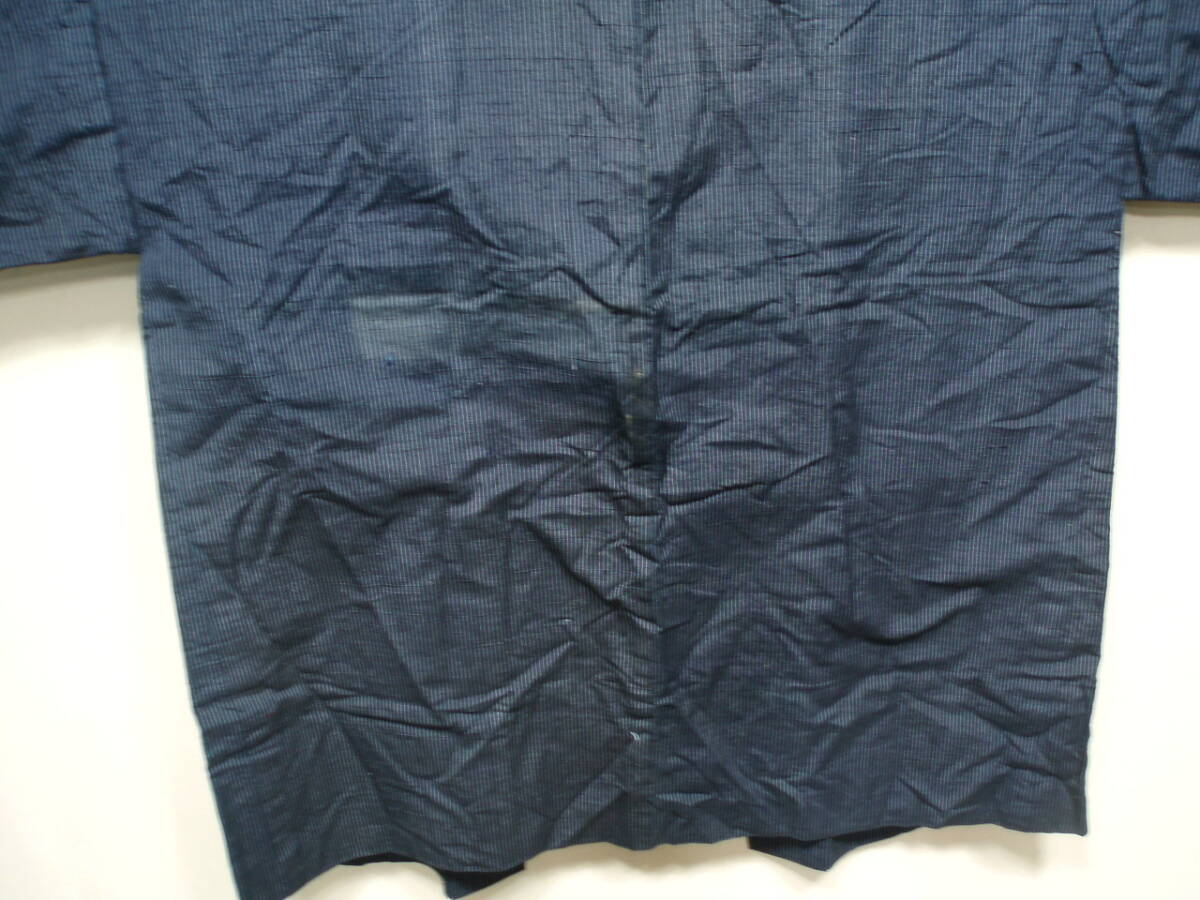 "" "M58031【生地取り用 リメイク用 着用用 古布 綿 藍 縦縞絣 綿正絹 交ざり】男 羽織" |