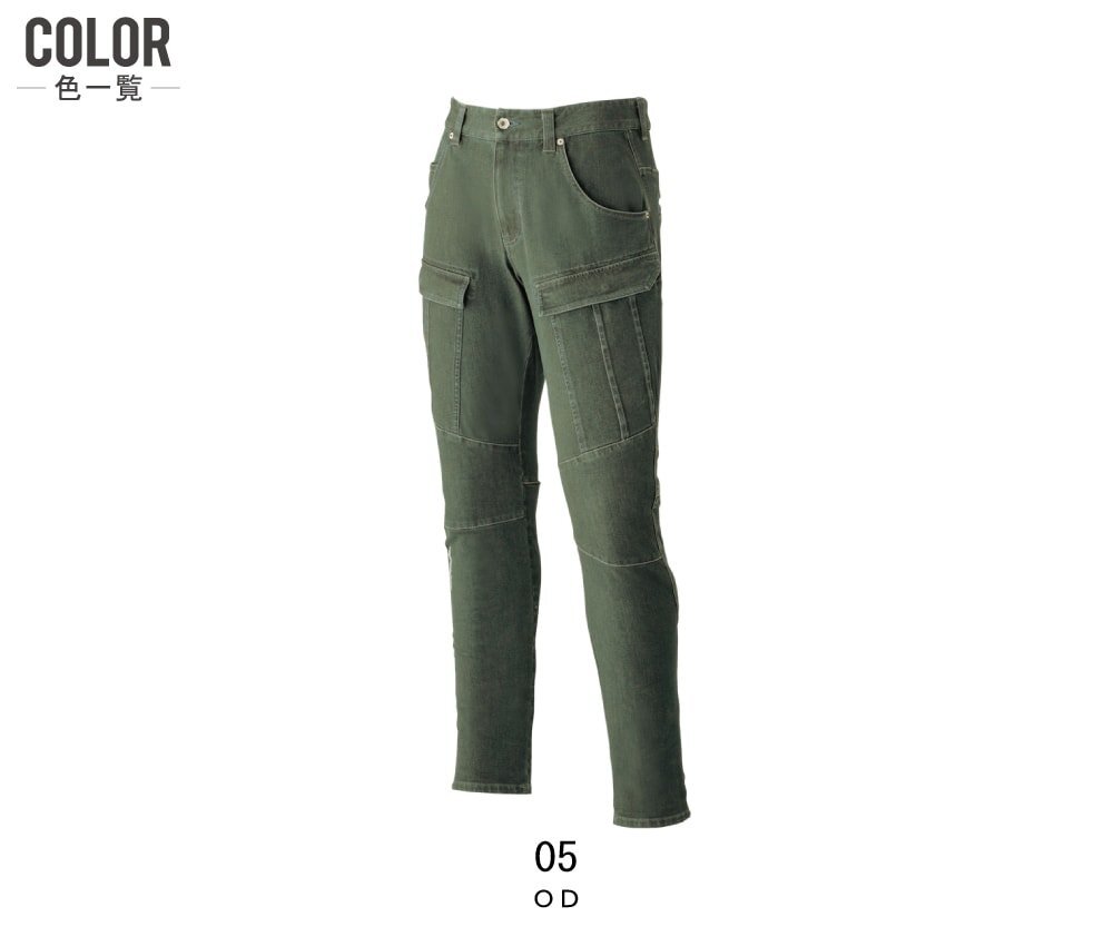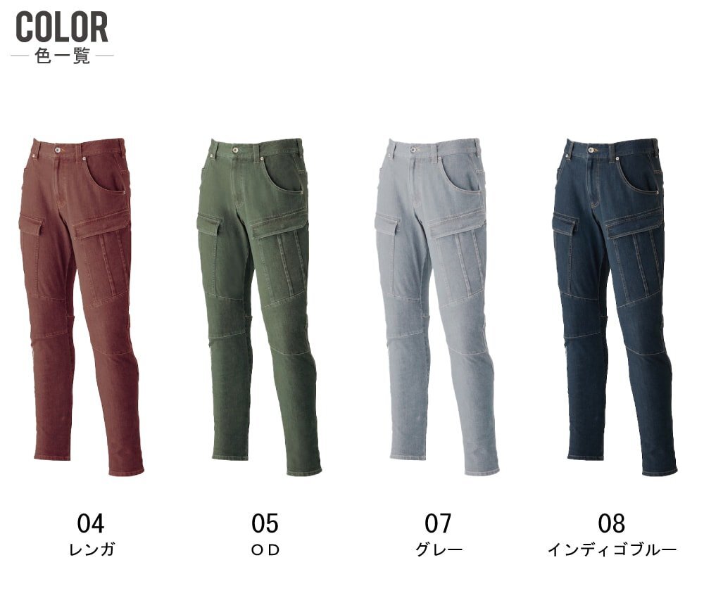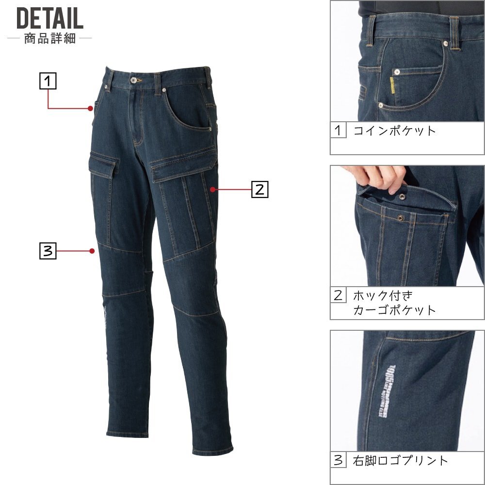 特長:ダブルストレッチ/コインポケット/ホック付カーゴポケット/膝ダーツ