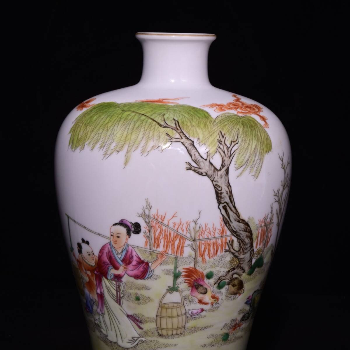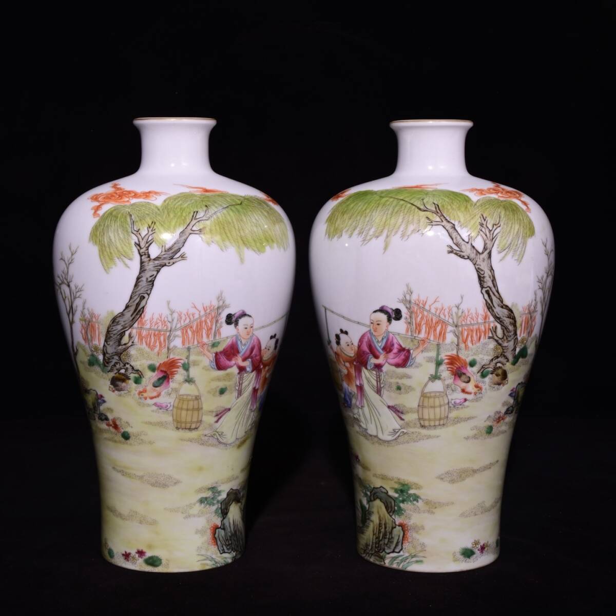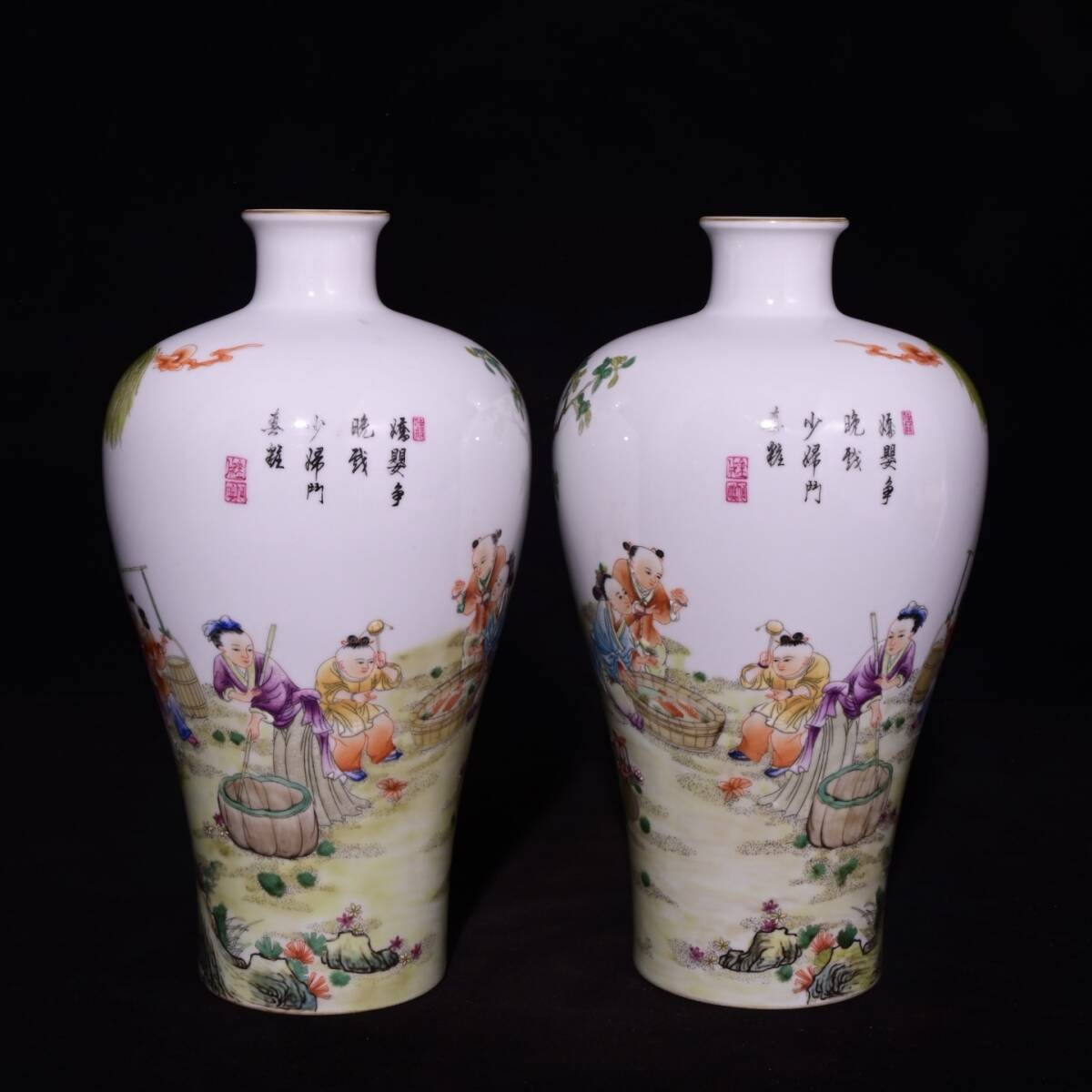 館蔵 清時代 雍正御製 琺瑯彩 人物紋 梅瓶 花瓶 花器 一対 古陶瓷 陶磁器 貴重 稀少 中国古美術 古美味 蔵出