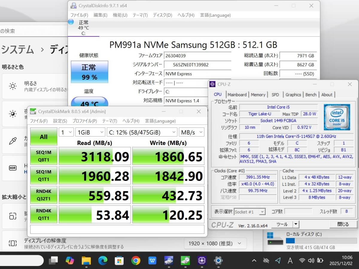 | CPU: 超高速 Intel 卓越性能 第11世代Core i5-1145G7 2.6Ghz、 4コア8スレッド (ターボ・ブースト利用時の最大周波数 4.4GHz) |