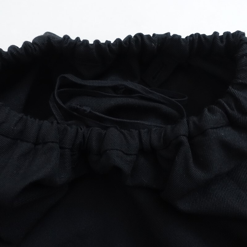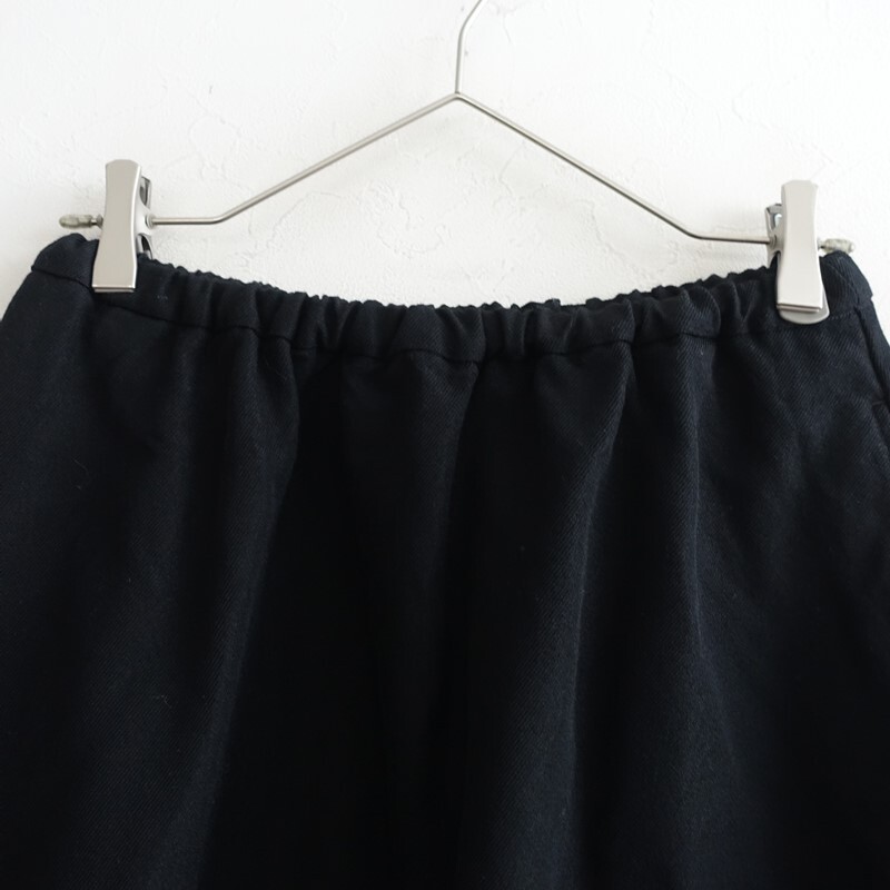 | kotonのウールツイルコクーンスカートです。カラーはブラックです。斜めの畝がくっきりとしたウール100%の中厚ツイル生地を使用。透け感はございません。ウエストはゴム&紐入りのイージー仕様。内側にサスペンダー用のタブが付いていますが、吊り紐などの付属品はございません。膝下辺りに切替えを配したコクーン・バレルシルエットのスカートです。両サイドにシームポケットがございます。 |