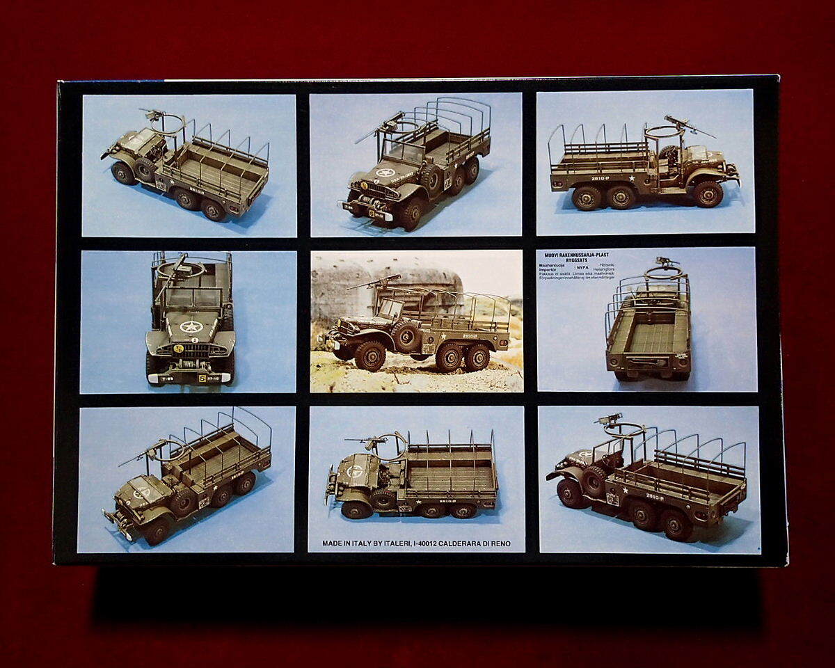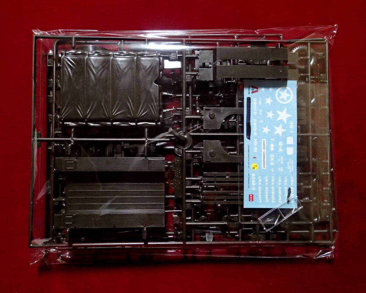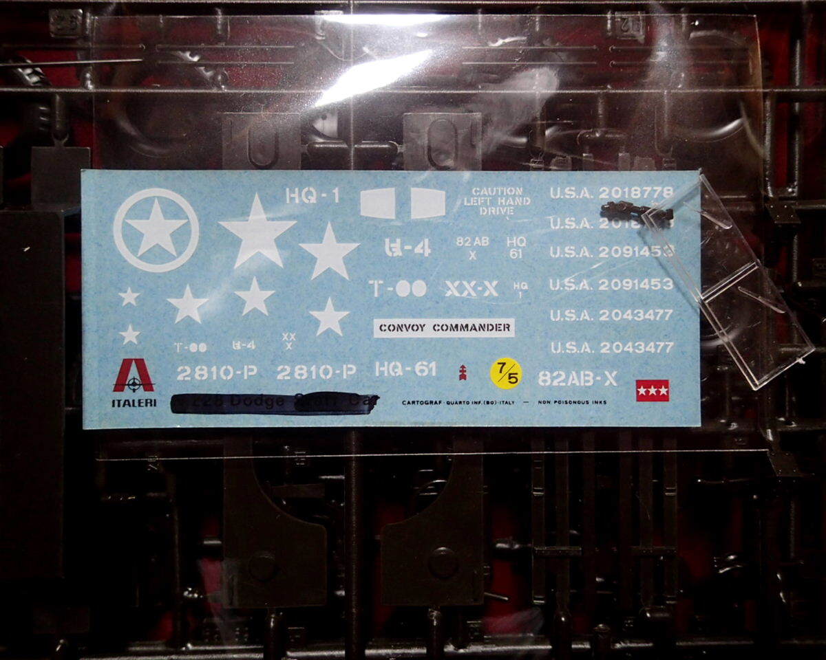 ※購入時からデカールがイタレリ(228:アイテム No.の部分が黒塗りされています)のダッジ スタッフカー(WC56/57)のものが入っていました。マーキングの大部分はダッジトラックと共通していますので、使用に問題はないと思います。