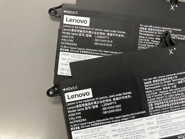| ThinkPad X13Gen2/Gen3付属 バッテリーパック 2個SET 共に約12H持ち 100%充電後にAC CORDを外して約15分後の数値です 約12時間の数値を確認しました 使用方法により誤差がありますのでご了承下さい (稼働時間を全て計測はしていません) MODEL L20M4P73 ASM P/N SB10W51954 FRU P/N 5B10W51853 MODEL L20M4P73 ASM P/N SB10W51919 FRU P/N 5B10W51818 汚れや膨張はありません *中古品ですので状態を気になさる方は入札をご遠慮願います 当ストアは土曜、日曜、祝日はお休みさせていただきます。 その間のメールの返信及び商品の発送等のご対応はできませんので ご了承願います。翌営業日にご対応させていただきます。 《ご注意下さい》 2022.5月よりストアーアプリが更新された為、ご迷惑をお掛けするかもしれません(アプリに不慣れな為) 当ストアより直接入札者様へ次点繰り上げのご連絡及びお取引の ご案内のメール等は一切しておりません。 次点繰り上げの場合は必ずyahooより確認のメールが届きます。 くれぐれもご注意下さい。 | |