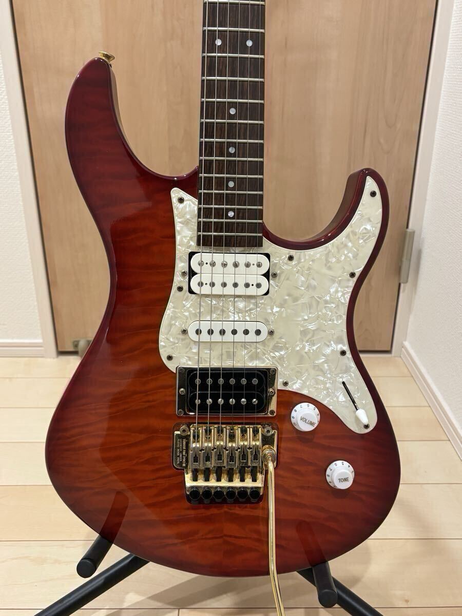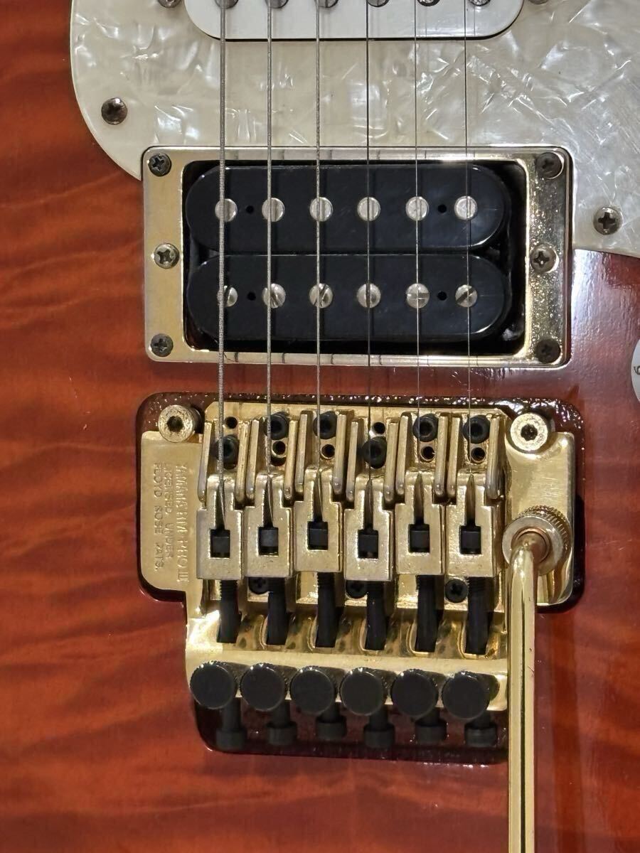 キルテッドメイプルの木目をミクロのインク膜で表現した美しい仕上げの本体に、ピックアップはオリジナルのアルニコピックアップを搭載し、ブリッジはRockin’ Magic Pro3を搭載しています。