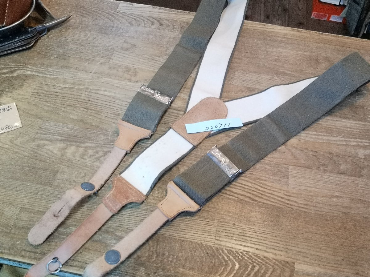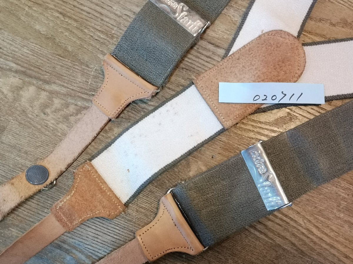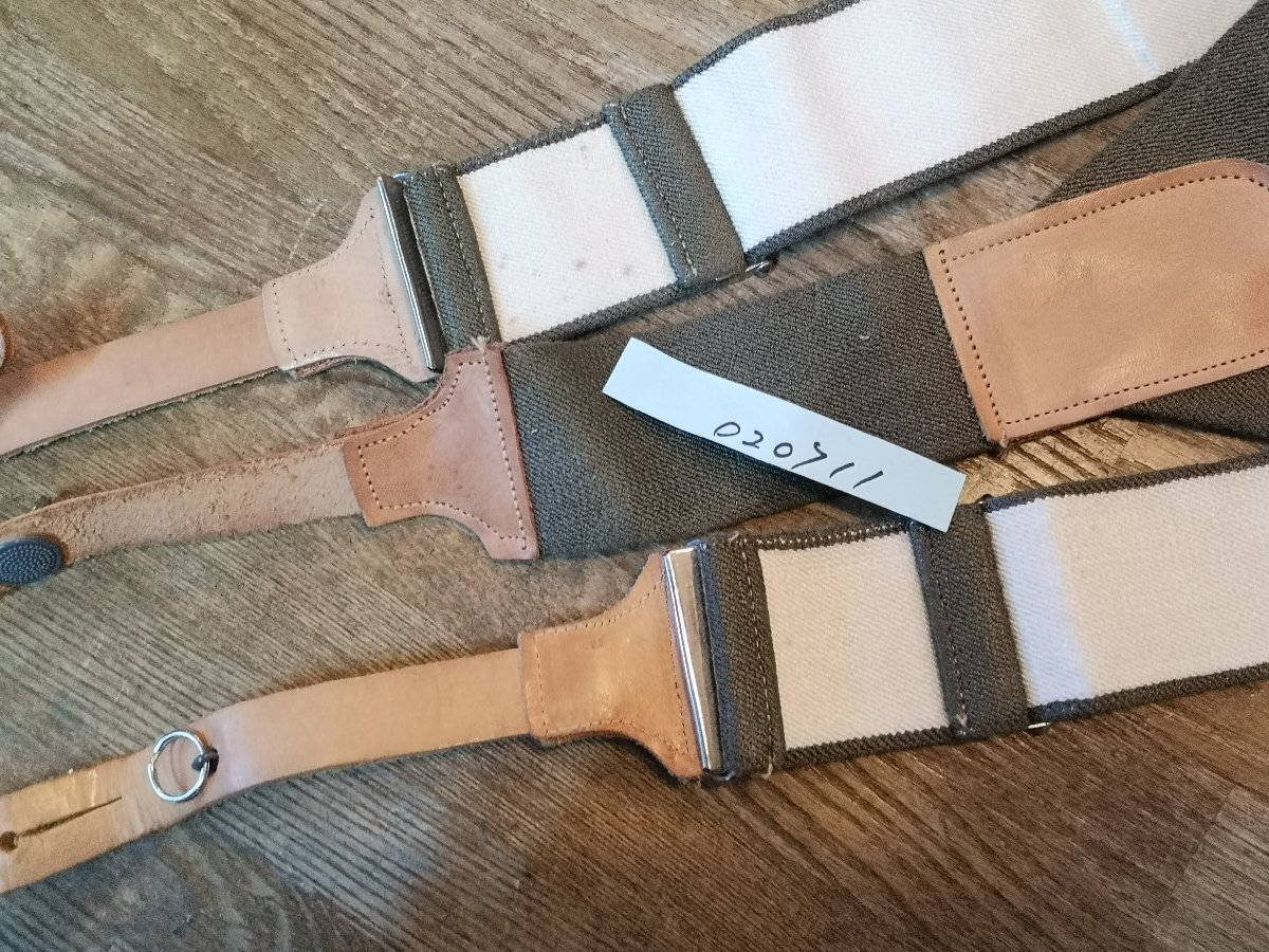 1枚目の写真は流用です。若干のユーズドです。 東ドイツNVA放出のレザーコンビのサスペンダー、パンツ側のDリングやベルトループで固定する便利なタイプです。ベルト幅は4.5センチ程度、ラバーサスペンダーですので伸びますが最長サイズは静止状態でボタンホールの間が110センチ程度、伸ばせば120~130センチ前後程度で基本的に男性用サイズです。 クロネコネコポス便200円でお送りいたします、落札価格にプラスでお願いいたします。服飾小物 。