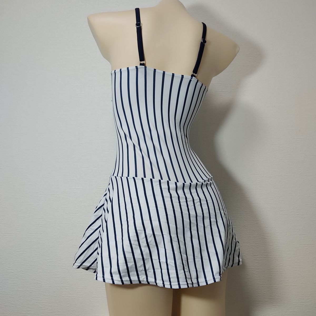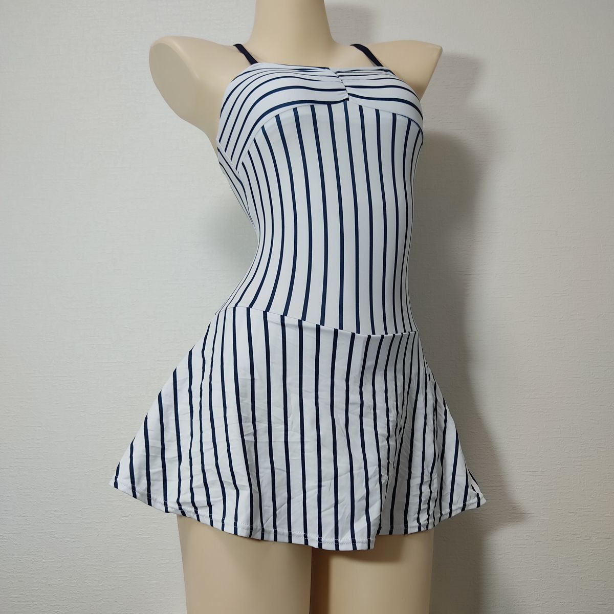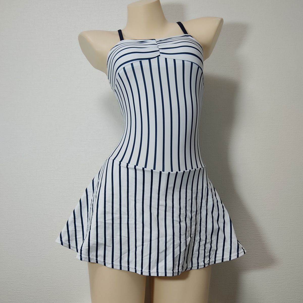 30*イオン女子水着(160L程度)★スカート キャミソールタイプ光沢ホワイト白ブラック黒ストライプ★伸縮性あり大きいサイズ男性も