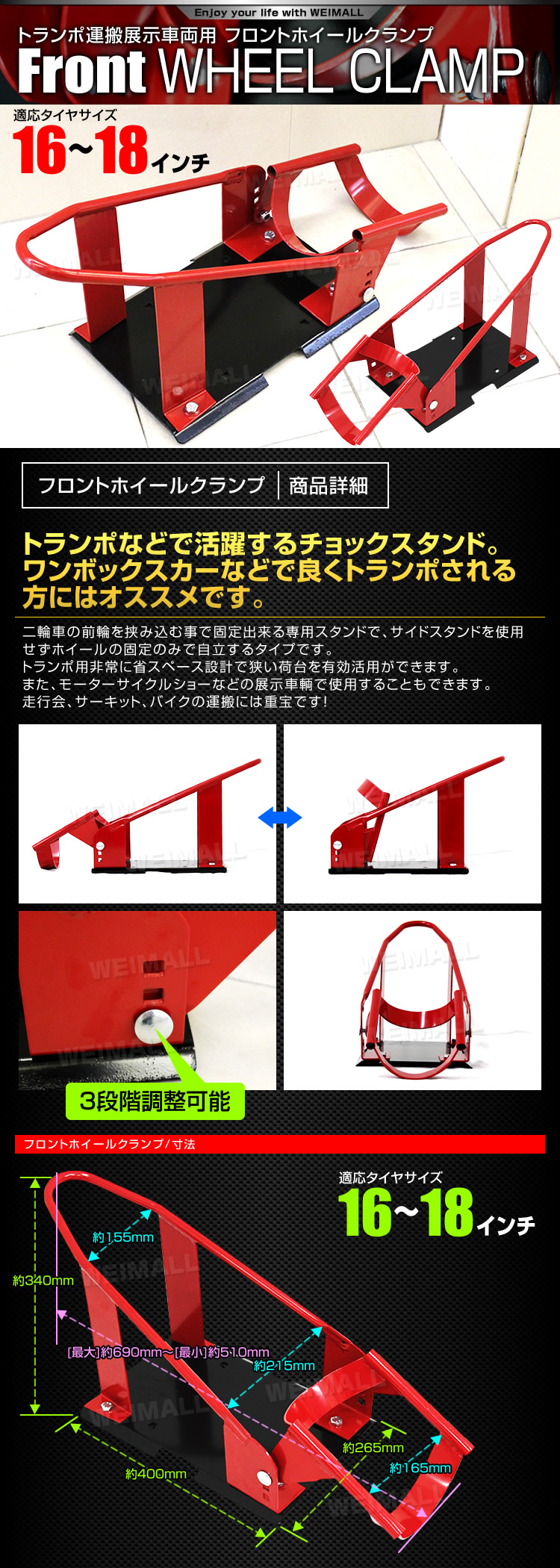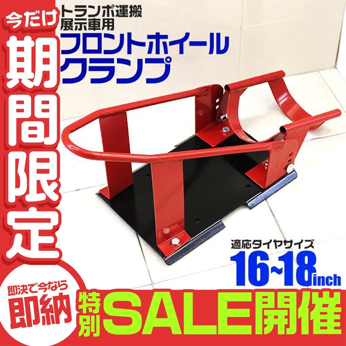 ワンボックスカーなどで良くトランポされる方にはオススメです。 二輪車の前輪を挟み込む事で固定出来る専用スタンドで、 サイドスタンドを使用せずホイールの固定のみで自立するタイプです。 トランポ用非常に省スペース設計で狭い荷台を有効活用ができます。 また、モーターサイクルショーなどの展示車輌で使用することもできます。 走行会、サーキット、バイクの運搬には重宝です! 【商品仕様】 タイヤ対応サイズ:16~18インチ タイヤ幅:110~130mm ※110はタイヤ銘柄により多少グラつく場合があります。 重量(約):6.2kg 【注意事項】 単車を押し前輪部分をクランプ部分にポコっと乗せるだけで固定されますので固定までわずか2秒程度です。 解除は車輌を後に引っ張るだけでです。(シーソーの原理です) (バイクスタンド トランポ運搬 フロントホイールチョック フロントホイールクランプ ホイールチョックトランポスタンド 展示車両用 トランポ ホイールチョック ホイールクランプ 二輪車 バイク 激安 最安値 特別価格 セール) |