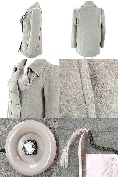 | 大人フェミニンなウールコートの入荷です♪ アンゴラミックスの柔らかで暖かな一品。 上品なライトグレーと裏地のピンクレオパードが絶妙です☆ 肩付け根にタックを入れ、女性らしいフデザインと 釦にあしらったラインストーンがポイント! ブランドタグ付近のリボンの一部にほつれがございます。 素材の特性上、薄い毛羽立ちが見られます。 着丈約66cm 袖丈56cm 肩幅35cm バスト約92cm 【サイズ】:(2) 【素 材】:(表地/アンゴラ65%・毛35% 裏地/ポリエステル100%) 【 色 】:(グレー) 【程 度】:(AB) **** 8422-20150824-013 487 001 | ||||