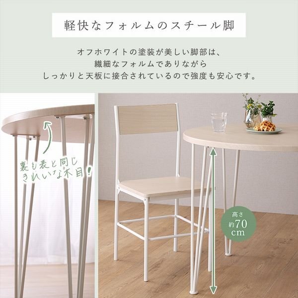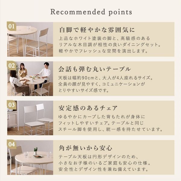 天板サイズ90cm幅のさわやかな円形ダイニング5点セット! ホワイトスチールと木目の相性がバッチリです。 天板サイズ90cm幅だと4人掛けにはちょうどいいサイズです。 円形だとコミュニケーションがとりやすくなるので、お互いの顔が見やすく家族や友人と仲良く過ごせます。 角型テーブルじゃないので、角にぶつかってもケガの心配がないです。 どこからでも座ることができ、席に座りやすいのが特徴です。 イスは背もたれ付きなのでゆったり座れます。 |