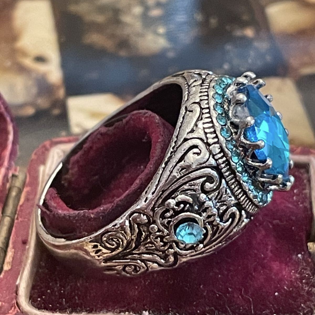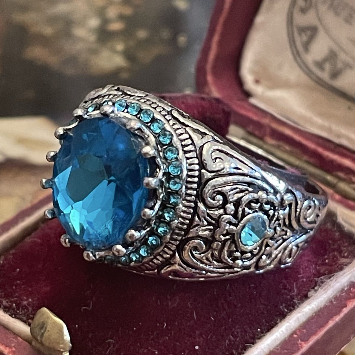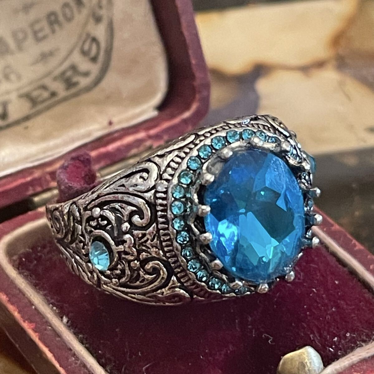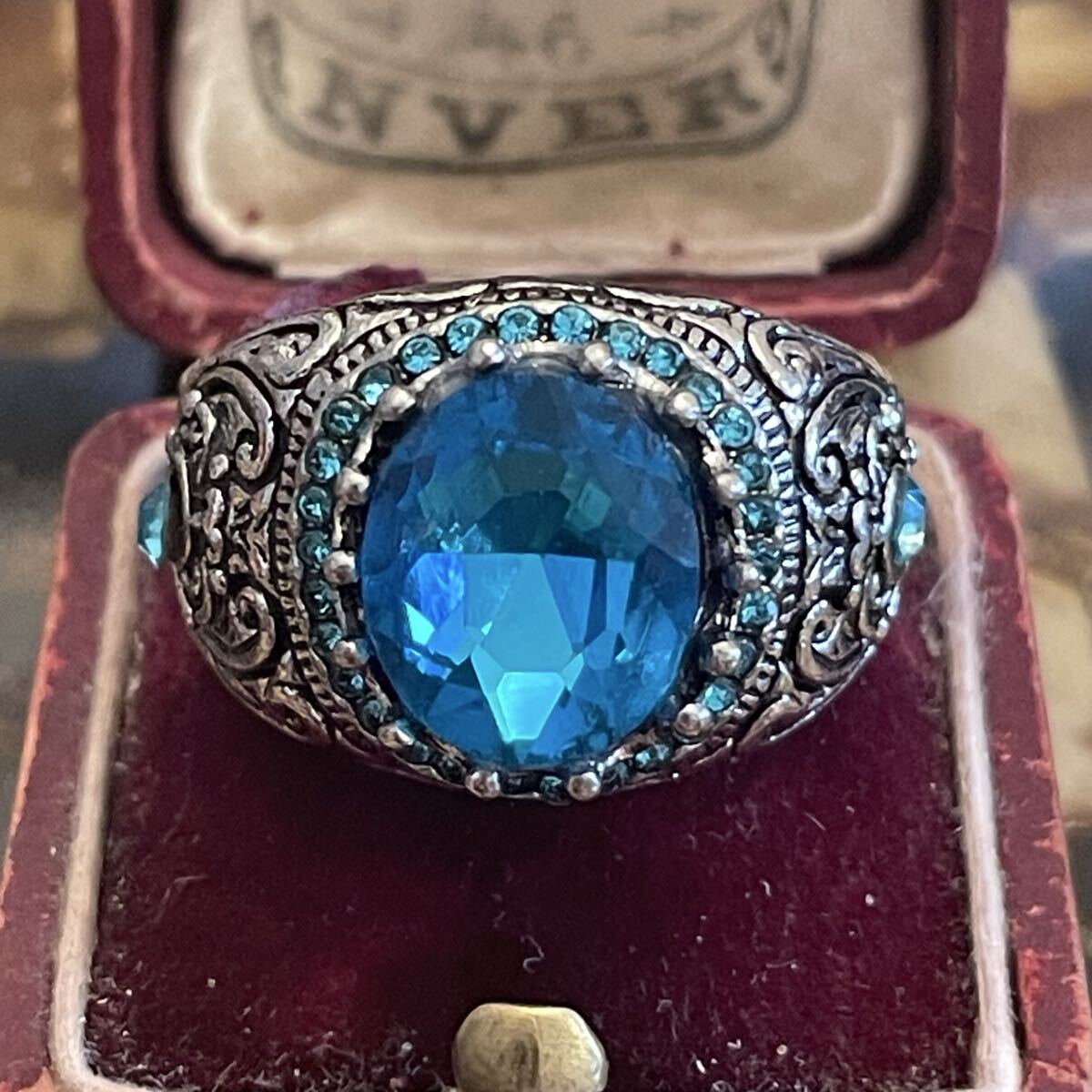 英国 イギリス ヴィンテージ ブルートパーズ風 青 水色 指輪 リング 26号 派手 推し活 推し色 青担当 銀色 シルバー LIVE参戦 演劇 小道具 コスプレ ビンテージ アンティーク