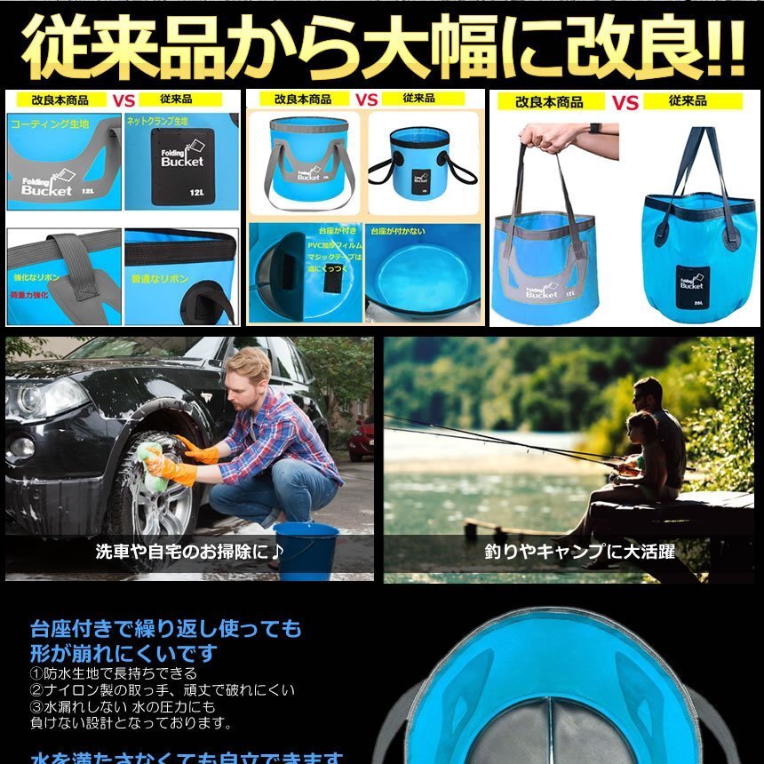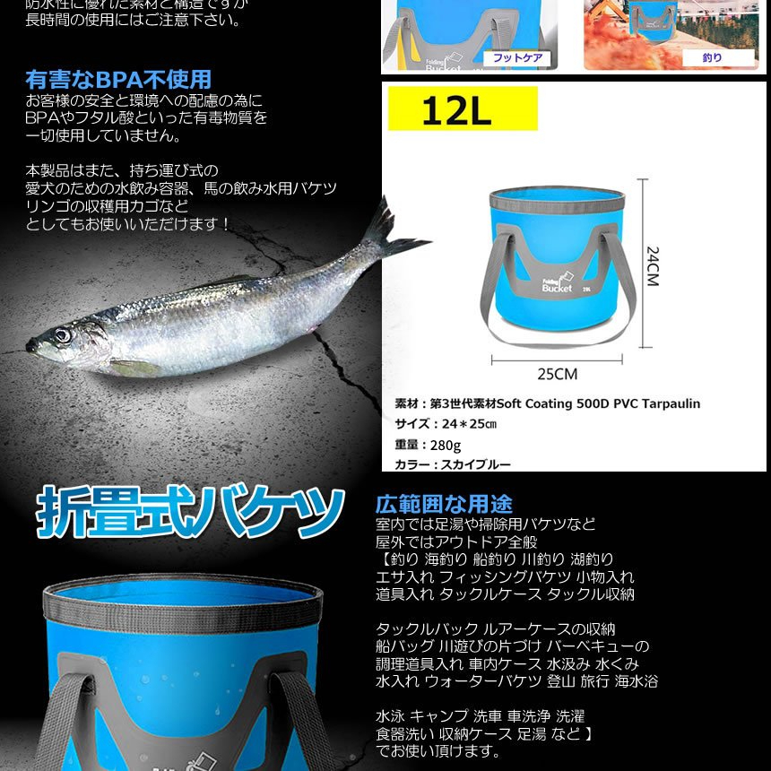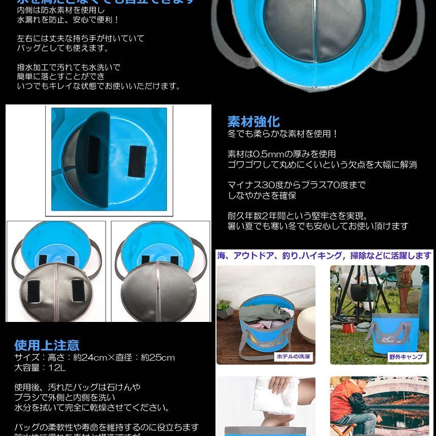 | 送料無料!!! 送料及び下記のご案内をご確認の上、ご入札お願い致します。 離島地域を除く九州、四国、本州まで送料無料。 ※北海道は+1000円、離島地域及び沖縄県は+3000円にて承ります。(発送前に加算) ※画像内にカラー及びサイズ等の選択が可能と記載がある場合がございますが、 お届けする物はタイトルまたは商品説明文に記載の物です。 ★※注文後のカラー変更や異なるカラー・サイズ指定等は一切承っておりません。 ※★※仕様(ロゴデザイン/ロゴ有無等も含む)は予告なく変更する場合があります。 ※多少の汚れや小傷がある場合がございますがご了承ください。 梱包は簡易包装ですので、箱の角落ち等はご了承願います。 【商品説明】 ポケットサイズの超万能バケツ!! 台座付きで繰り返し使っても形が崩れにくいデザインの円形バケツです。 強靭な防水生地を使用しました。 水漏れせず水の圧力にも負けない設計です。 水を満たさなくても自立できます♪ 内側は防水素材を使用し水漏れを防止、安心便利! 左右には丈夫な持ち手が付いていてバッグとしても使用可能♪ ランドリーバッグなどに流用可能です! 便利な持ち手のついた折りたたみ円形バケツ。 円形なので安定性も◎ 汚れた洗濯物やBBQ・キャンプに洗車にも使える便利なバケツ。 折畳み式なので、収納時に邪魔にならないデザインです。 使い方次第で、用途が広がる万能洗い桶です。 台座(中敷き)が付属していますので、使用時はバケツを広げ、 底のマジックテープに合せて設置してください。 ================== 【商品仕様】 [折り畳み時] 長さ: 約27cm×幅: 約13cm×厚み: 約3.5cm [使用時] 幅: 約25cm×高さ: 約26cm 重量: 約280g 容量: 約12L 温度: 耐熱温度: 70℃ 耐冷温度: -10℃ 素材: PP(ポリプロピレン) TPR(エラストマー) ================== ![]() ![]() ![]() ![]() ![]() ![]() |