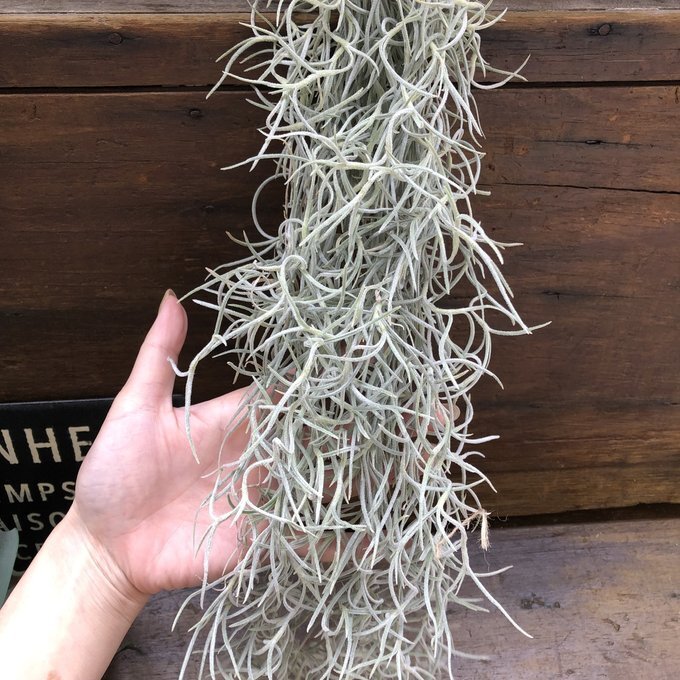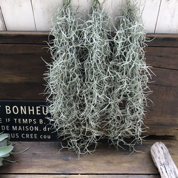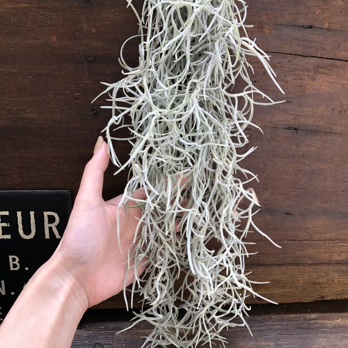 チランジア ウスネオイデス スパニッシュモスです。 ※現在流通がほとんどなく、入手困難となっております。 流行りのおしゃれなインテリアプランツです。 かなり綺麗で、太葉ですので大満足です。 全長約40センチ程度です。 早いもの勝ちになります。 ★置き場所 真夏の直射日光や高温になる場所を避けて下さい。 風通しの良い明るい窓辺などがオススメです。 冬は室内であれば充分越冬します。 ★水やり 乾燥に強いです。 5日に1度くらい霧吹きか、水につけて吊るして下さい。 手間いらずのおしゃれな植物です。 ぜひお部屋に飾って下さいね。 他にも色んな種類のセダムや多肉植物を販売しておりますので、よかったらご覧ください。