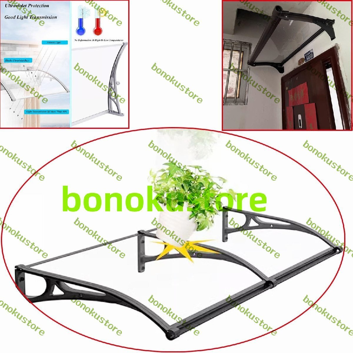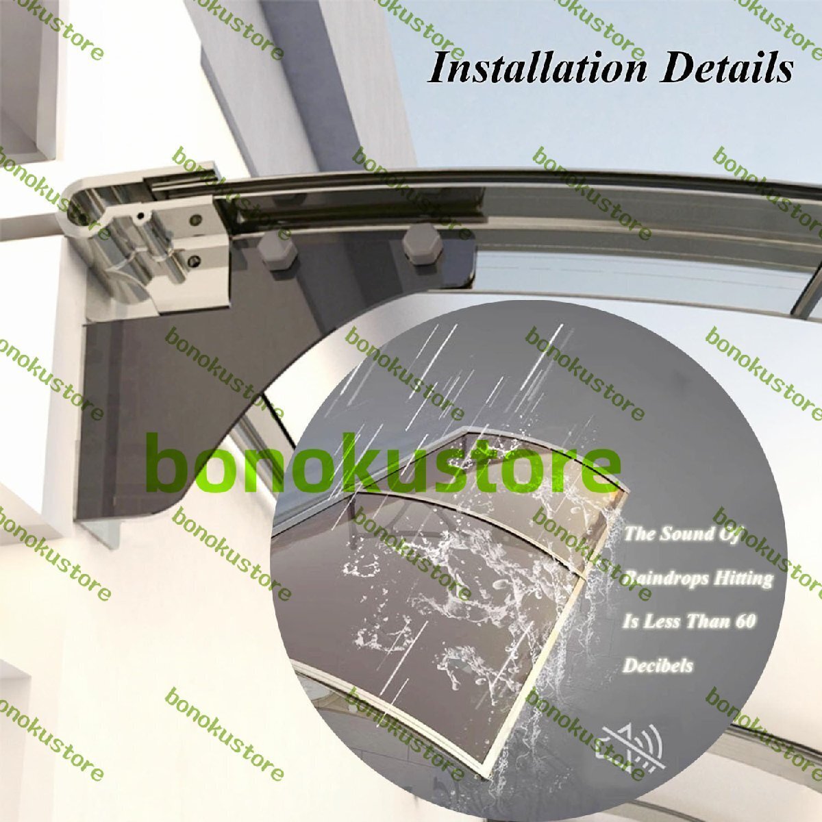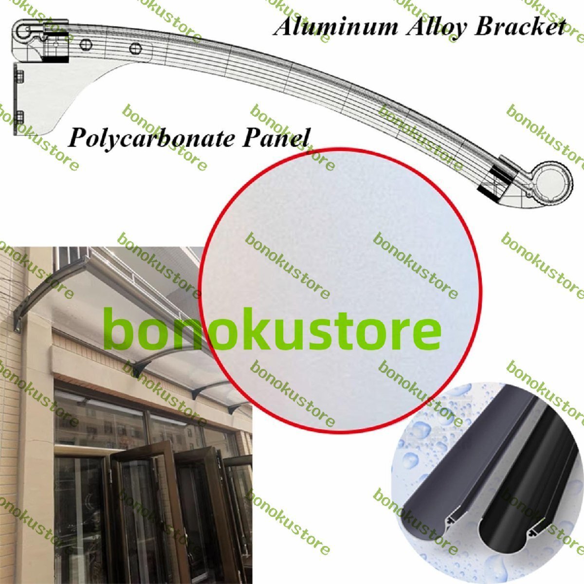 材質:キャノピーは厚さ3.5mmのポリカーボネートカバーとアルミニウム合金ブラケットで作られており、安定性と耐衝撃性が強く、落下物や雹の侵入を効果的に防ぎます